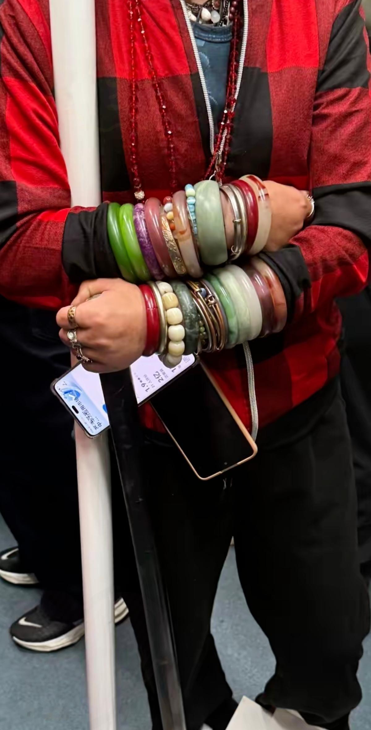 被大姐的手腕惊艳到!足足戴了五六七八只手镯,金的、玉的、细链的堆在一起,走动时叮当响,居然一点不杂乱还挺吸睛!手镯大妈