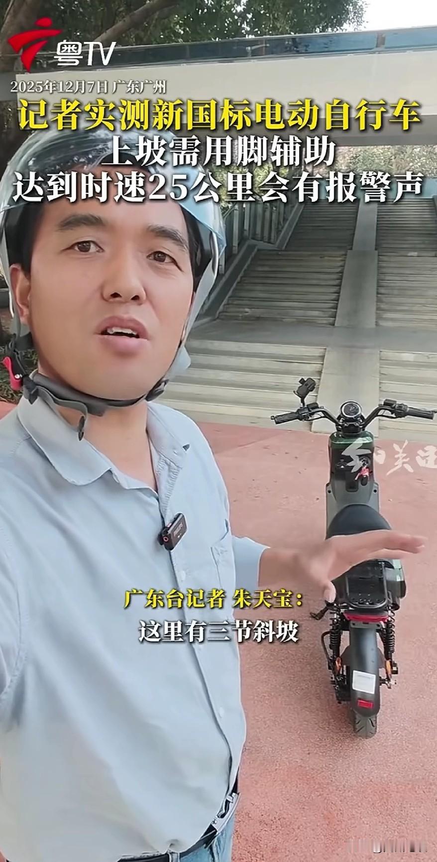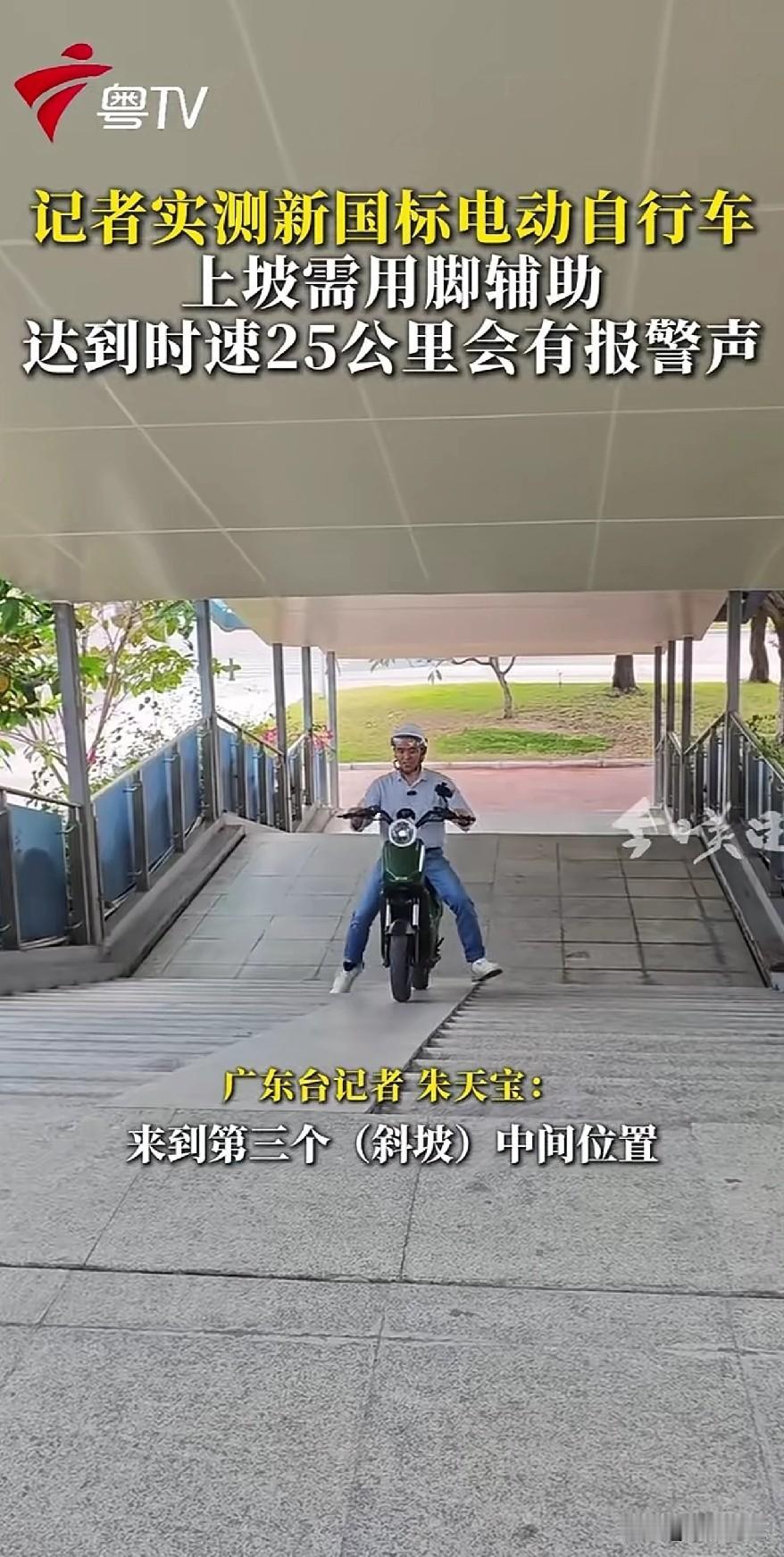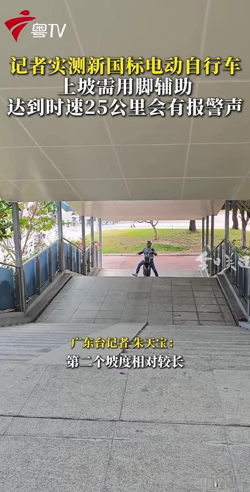 新新国标电动车爬坡能力如何?记者亲自测试!但记者同志这种测试条件是不严谨的,甚至是错误的,没有任何意义,只会误导群众以为这种天桥斜坡可以开上去。 这种人行天桥根据规定只能下车推行,不能骑行。人行过街天桥首先是满足行人过街需求的,当非机动车借用人行天桥过街时,因为没有划设专门的非机动车道,就需要下车推行,避免对行人造成危险。 真的要满足实际爬坡需求,测试骑行上坡就去海印桥南的北行上桥斜坡测试。 至于很多人说推不动的问题,如果推不动就不要买这么重的车,还有很多三十几公斤的新国标电动自行车,就是那种老款式的。 那种很容易推的动,就是小女生也推的动。甚至有的还有推行助力。只是要带着刹车,控制好才行,防止冲出去。 ttps://m.toutiao.com/is/bZb0xzOyjb0/ 电动车
