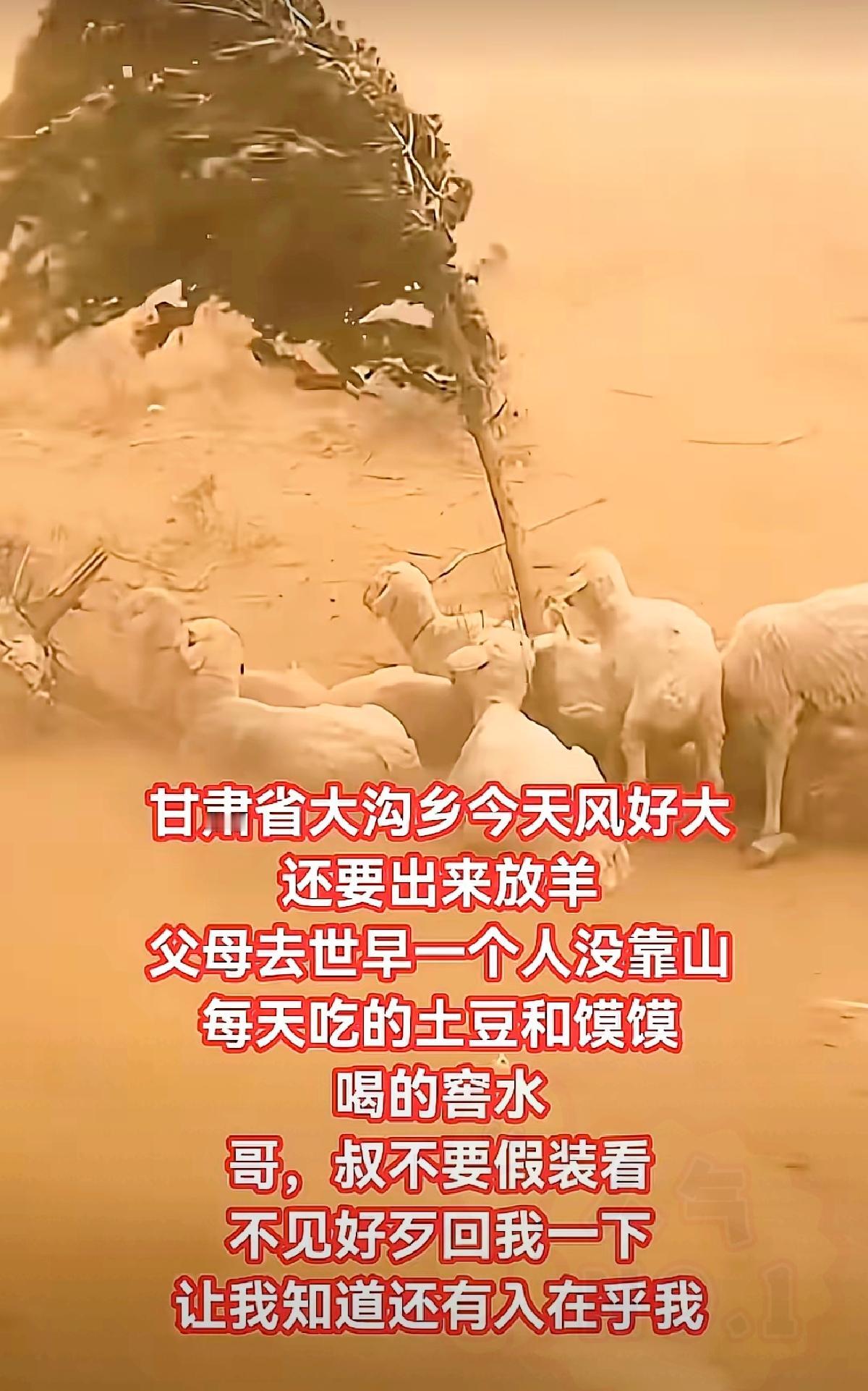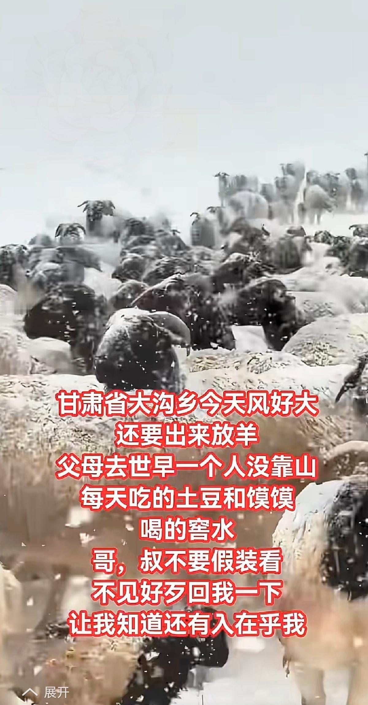 甘肃省大沟乡,今天风刮得人睁不开眼,一个姑娘还得顶着风出来放羊,父母走得早,一个人没靠山,天天吃土豆和馍馍,喝窖水发个消息说:“哥叔不要假装看不见,好歹回我一下,让我知道有人在乎我。”看到这段话,心里真不是滋味。 很多人嘴上说“吃苦是福”,但真正在冰天雪地里扛着生活往前走的人,其实没多少人真正看见。我们习惯在手机里刷着光鲜亮丽的生活,却常常忽略了还有人在为一顿热饭、一件厚衣服发愁。 我一直觉得能在这种环境里咬牙坚持的孩子,本身就是一种了不起的能力。她不是“可怜”两个字就能概括的,她是在拿命拼生活。真正的坚强,不是嘴上说“我能行”,而是明知道很难,还每天照样起来放羊、做饭、过日子。 我更希望的是当我们在评论区说“加油”的时候,也能想一想:自己能做的,是不是不止一句“你真棒”。哪怕是转发一下,让更多人看见她的处境,或者在自己力所能及的范围内,给一点实际的帮助,都比空洞的安慰有用得多。 你觉得我们在面对这样的孩子时,光说“加油”够不够?如果是你,会愿意为她多做一点什么吗?会宁大沟