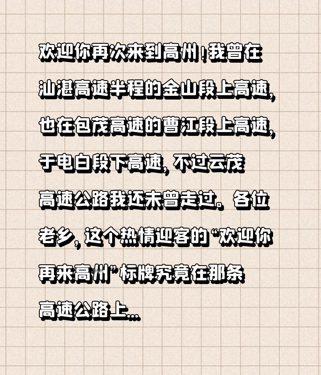 欢迎您再来高州! 我在汕湛高速半程的金山段上过高速到广州,也在包茂高速的曹江段上高速,在电白段下高速,不过云茂高速公路我还未曾走过。 各位老乡,这个热情迎客的“欢迎您再来高州”标牌,究竟在那条高速公路上呢,该不会是现在才安装上去的吧! 反正我真是见都没见过的!