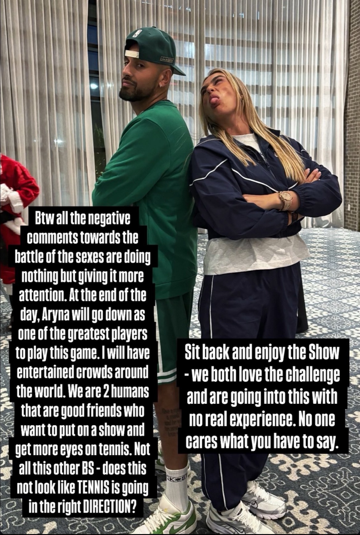 网球talking大会 尼克·克耶高斯🇦🇺回应了关于他与世界排名第一的阿丽娜·萨巴伦卡之间的“性别大战”的批评:🗣️ “所有关于《性别之战》的负面评论只会让它获得更多关注。最终,艾琳娜仍将是这项运动中最伟大的选手之一。我曾在世界各地为观众带来精彩的表演。我们只是两个普通人,好朋友,想为大家带来一场精彩的演出,让更多人关注网球。而不是那些乱七八糟的东西——这难道不说明网球正朝着正确的方向发展吗?请放松心情,尽情欣赏这场演出吧。我们俩都喜欢挑战,而且都没什么实际经验就去做了。没人会在意你的看法。”