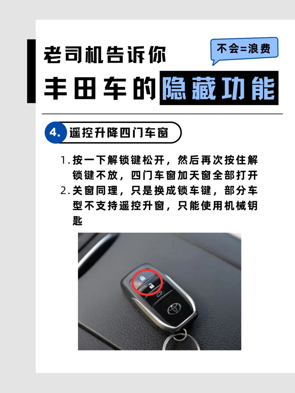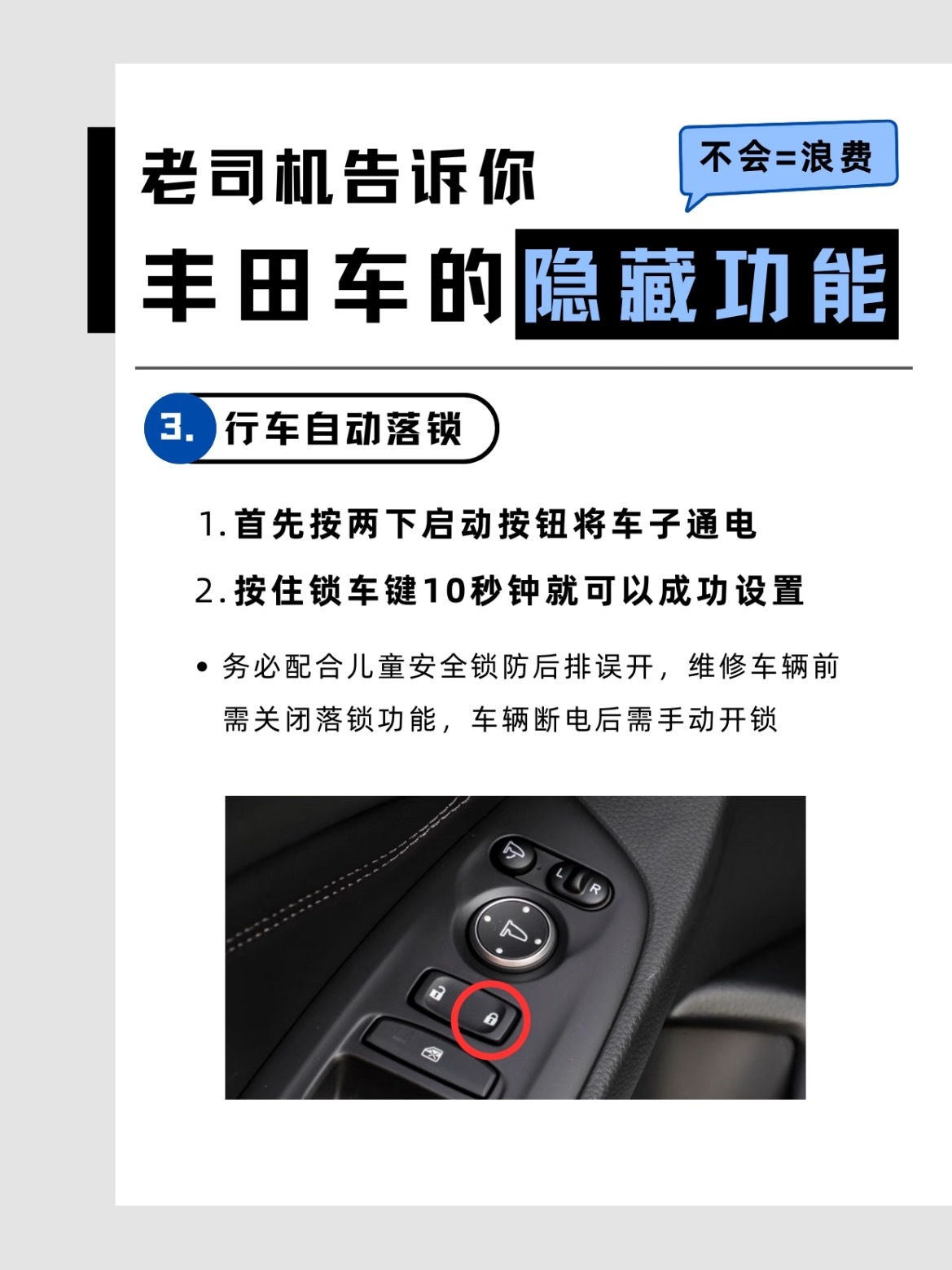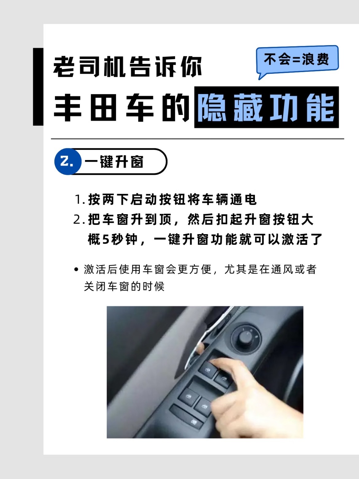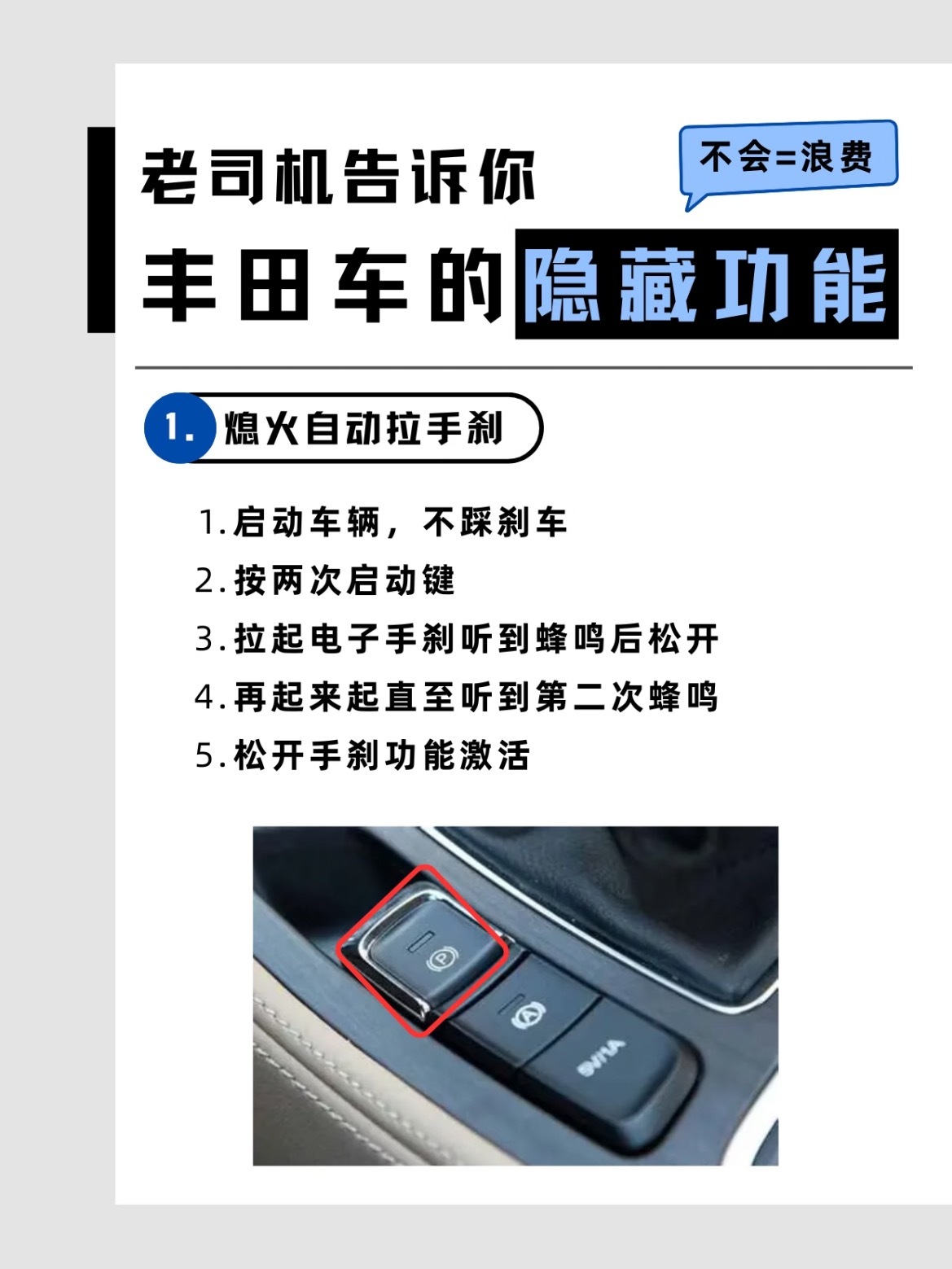 有些隐藏功能只能去寻寻觅觅而不能光看说明书🚗⚙️ 今天俺们就来看看丰田车的一些惊喜小彩蛋🔓 1️⃣ 熄火自动拉手刹启动车辆不踩刹车 → 按两次启动键 → 拉起电子手刹(听到蜂鸣松手)→ 再拉起至第二次蜂鸣 → 松开,激活成功✅下车再也不怕忘拉手刹,尤其适合坡道停车!🔓 2️⃣ 一键升窗激活通电不启动 → 把车窗升到顶 → 扣起升窗键保持5秒 → 激活完成✅之后开关窗只需按一下,通风关窗超顺手~🔓 3️⃣ 行车自动落锁通电状态 → 长按锁车键10秒 → 设置成功✅车速超过约20km/h自动上锁,提升行车安全,记得搭配儿童锁使用哦!🔓 4️⃣ 遥控升降四窗开门前按一下解锁,再长按解锁键 → 四窗+天窗全部打开🌬️关窗同理长按锁车键(部分车型需用机械钥匙锁车升窗)我与汽车的日常大v聊车