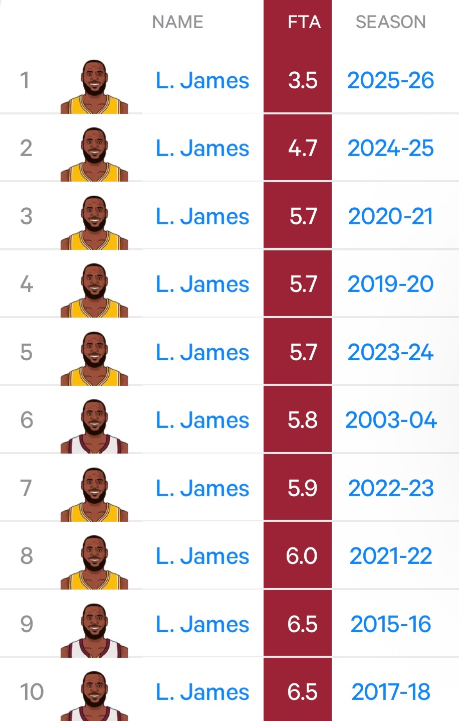 詹姆斯本赛季至今场均罚球3.5次生涯最低,比上赛季还低1.2次。