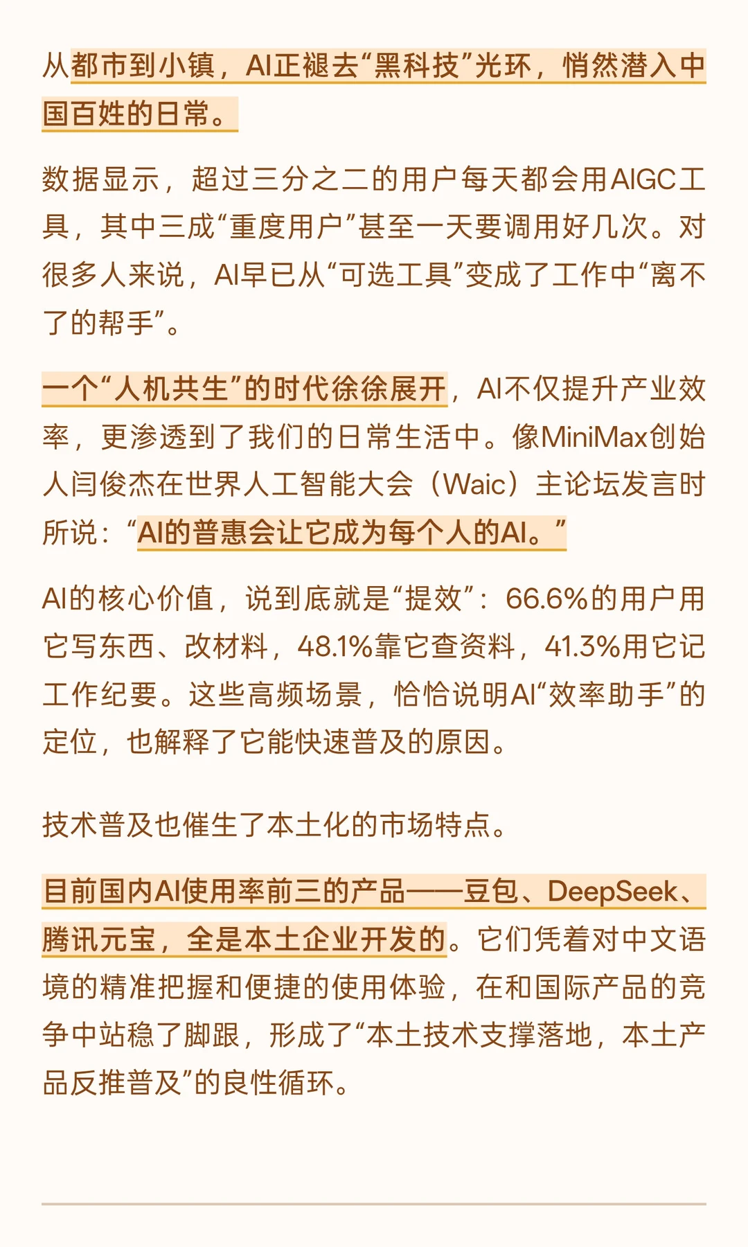 一个“人机共生”的时代徐徐展开,AI不仅提升产业效率,更渗透到了我们的日常生活中。像MiniMax创始人闫俊杰在世界人工智能大会(Waic)主论坛发言时所说:“AI的普惠会让它成为每个人的AI。”