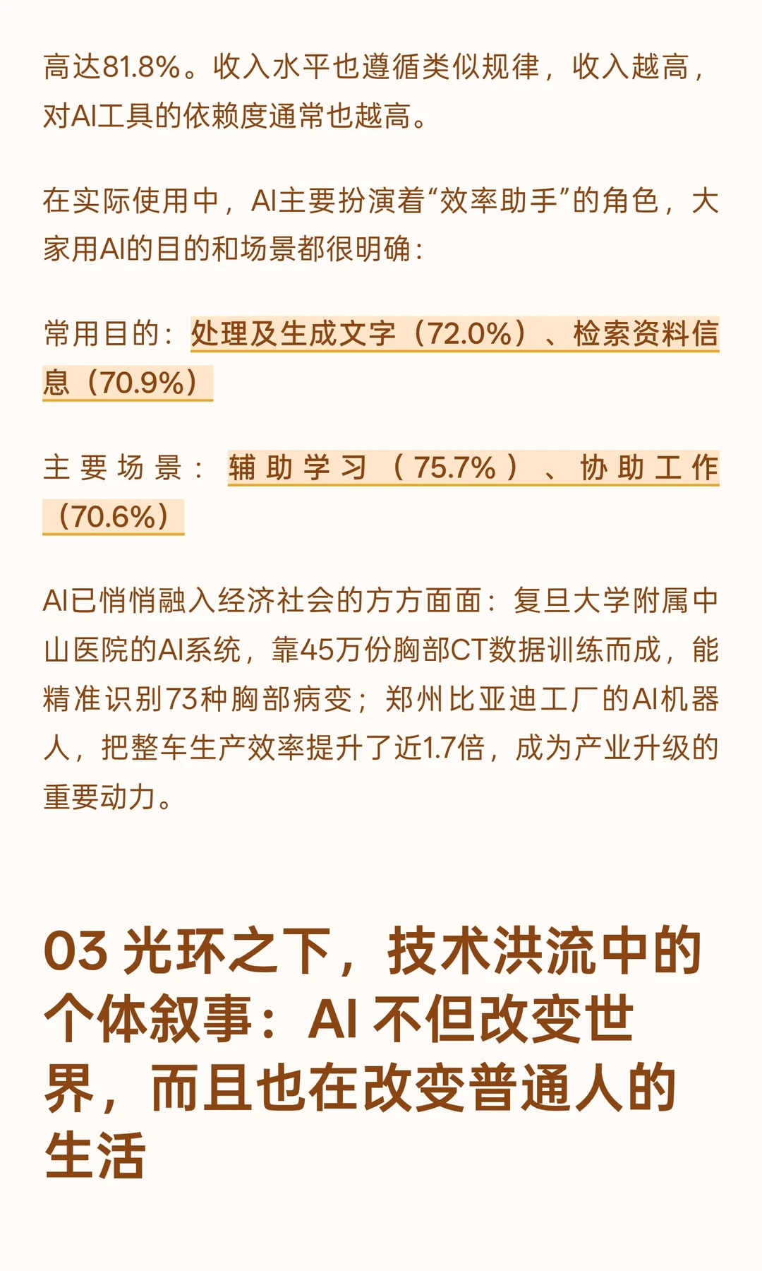 AI的核心价值,说到底就是“提效”:66.6%的用户用它写东西、改材料,48.1%靠它查资料,41.3%用它记工作纪要。这些高频场景,恰恰说明AI“效率助手”的定位,也解释了它能快速普及的原因。