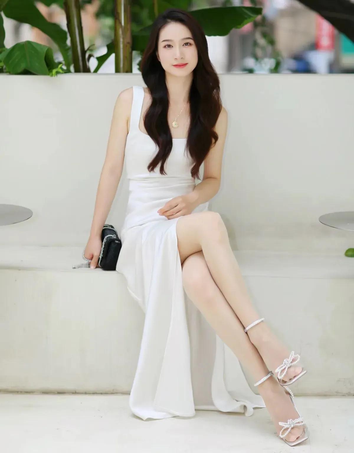 这套穿搭是优雅高级的白色缎面礼服风,温柔又带精致感。白色无袖缎面长裙自带光泽质感,修身版型+开叉设计凸显身形曲线,既保留了优雅气质,又增添了恰到好处的精致感;缎面材质在光线中更显高级精致。 黑色亮片手拿包与白色礼服形成对比,提升了造型的亮眼度;水钻凉鞋精致华丽,与礼服的优雅风格呼应,强化了整体的精致感;简约首饰点缀,让造型更显完整。白色无袖裙穿搭 白色缎面裙穿搭