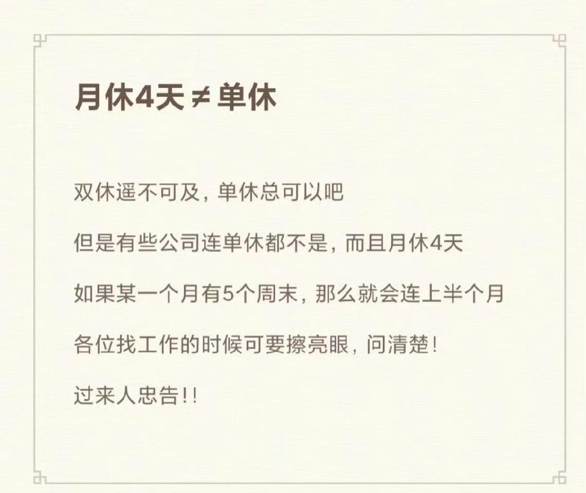 最近比单休更恶心的是月休4天 冲上热搜,看完直接血压飙升!找工作的宝子们千万别被“月休4天”的噱头骗了,这根本不是福利,是妥妥的职场陷阱! 单休再窒息,好歹每周固定休一天,每月运气好还能有五个周末,能踏实睡个懒觉、约朋友聚聚回血。可月休4天就是暗戳戳坑人,看似和单休差不多,实则把假期拆得七零八落,老板说啥时候休就啥时候休,想凑个周末陪家人都难,完全没了自己的生活节奏。更过分的是,有些公司这4天还是调休,随时能以“紧急任务”取消,调休单攒着永远用不出去,等于白给! 说白了,单休是明着卷,月休4天是暗着薅羊毛,有时候一个月五个周末的时候就得有一个周末不能休的,长期连轴转下来,休完比上班还累,精神一直紧绷着。打工人要的从来不是凑数的假,是能真正放松的休息时间,休息权本来就是我们的合法权益,不是公司的施舍! 有没有宝子踩过月休4天的坑?评论区说说你的离谱经历,互相避坑!愿所有打工人都能摆脱奇葩作息,找到真正能平衡工作和生活的岗位✨ 职场生存指南 打工人维权