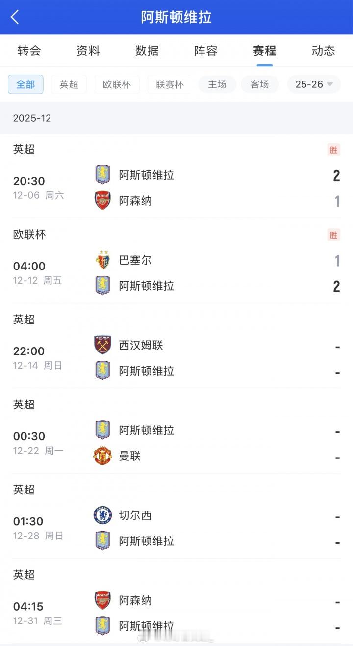 只输利物浦!欧联杯联赛阶段第6轮,半轮换阵容出战的维拉2-1客胜巴塞尔,目前5胜1平暂居欧联杯第三位。算上本场比赛,维拉近10场比赛9胜1负,只输给利物浦。目前维拉在英超联赛排名第三,落后榜首的阿森纳3分,未来4场比赛球队将先后在联赛对阵西汉姆联、曼联、切尔西以及再碰阿森纳。