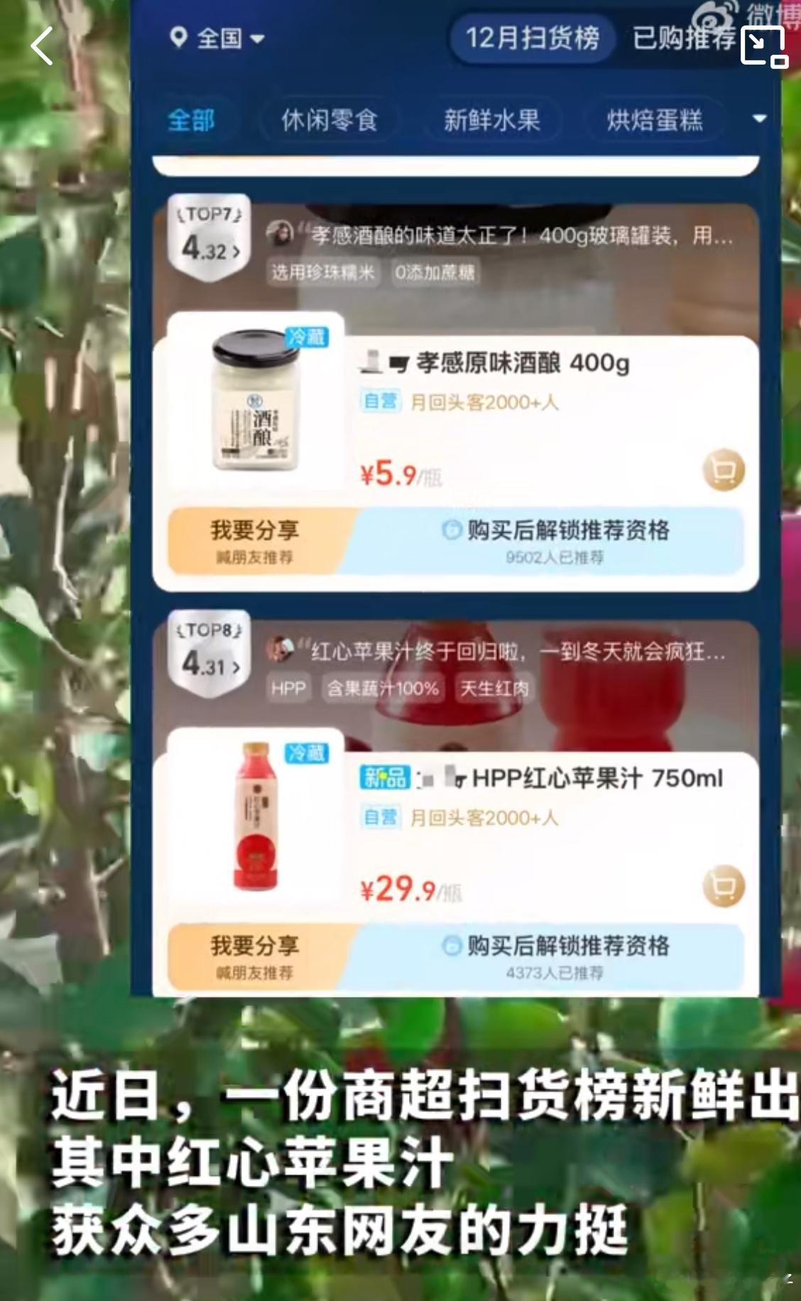 山东网友为苹果汁发起甜蜜冲击今天看到商超扫货榜结果,一眼就看到红心苹果汁冲得好猛!全国第八、山东第六,作为常年把它当早餐、小甜水搭子的人,真的一点不意外。它的酸甜度刚好,加片柠檬冰一下,那味道绝绝子,自从回归了我家冰箱就没断过货。最有意思的是之前投票期,刷小红薯有网友“花式变身”,有人说自己是“苹果汁本汁”,还有玩梗“熹妃回宫拉票”的,看评论区大家互相安利,比看选秀还热闹,这种为喜欢的东西认真打call的氛围也太可爱了!我听朋友说她还试过用它DIY,和小奶皮子酸奶混在一起,再撒点燕麦脆,酸甜里带点奶香,当下午茶小甜品绝了。山东人对苹果的爱果然名不虚传,从脆苹果吃到苹果汁,连投票都这么给力,感觉这份榜单里,藏着咱们对本地好味道的底气和偏爱~这届网友在帮超市选顶流
