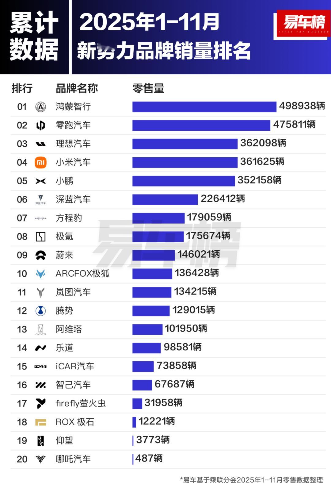 易车榜公布:1-11月新势力品牌销量前5名分别为:鸿蒙智行、零跑、理想、小米、小鹏;1-11月新势力车型销量前5名分别为:小米SU7、小鹏MONA M03、理想L6、问界M8、零跑C10。最后一个月了,感觉今年排名也不会有大变化了。鸿蒙智行小米su7