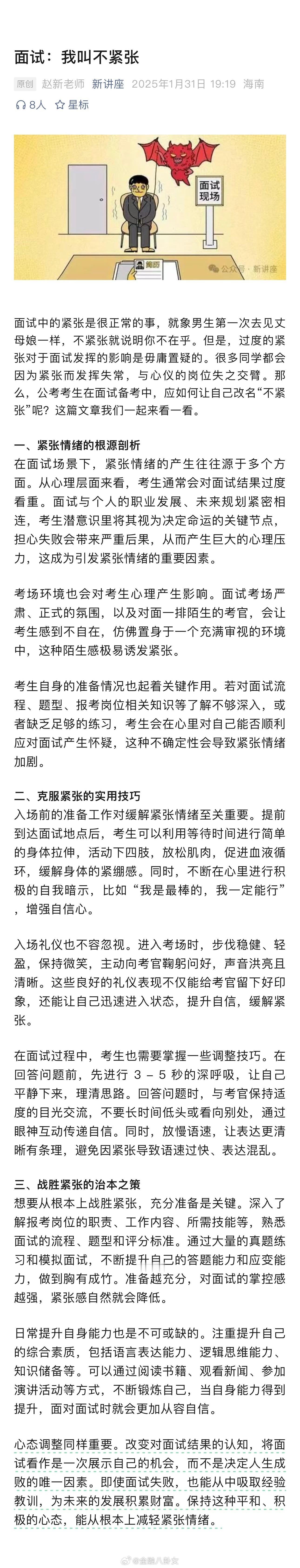 面试紧张太正常了几个放松小习惯:1、 到场先活动肩膀,默念两遍鼓励自己的话2、进门时微笑问好,声音放稳3、回答前轻轻吸气,眼神自然交流其实准备充分了,底气就来了。你有哪些缓解紧张的小妙招?👇