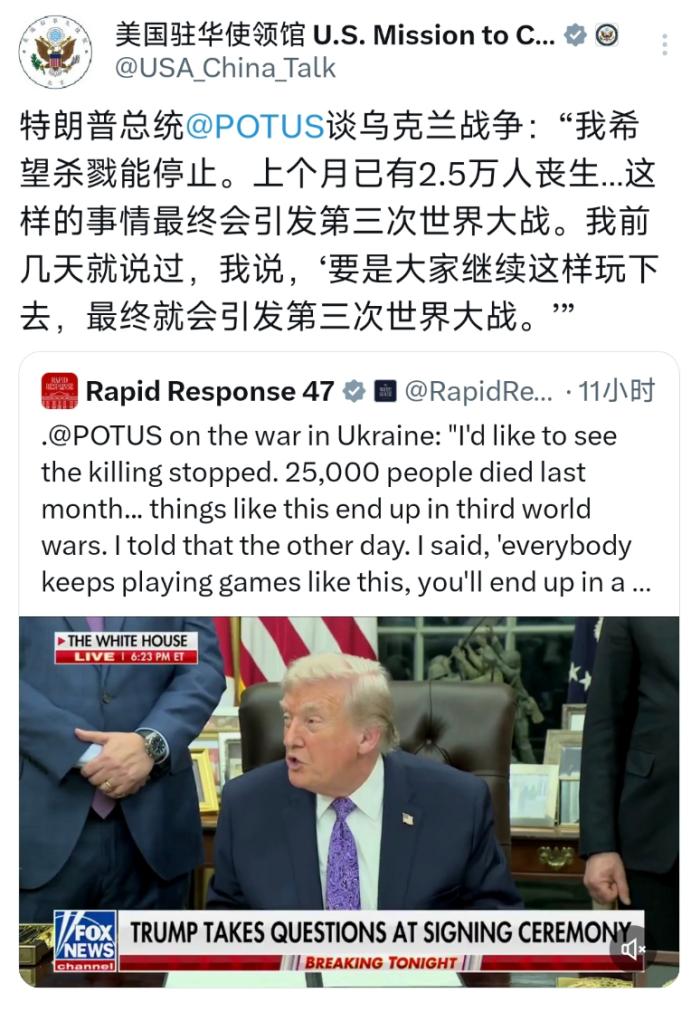 12月12日,美国总统特朗普谈乌克兰战争:“我希望杀戮能停止。上个月已有2.5万人丧生...这样的事情最终会引发第三次世界大战。我前几天就说过,我说,‘要是大家继续这样玩下去,最终就会引发第三次世界大战。’” 说白了,这不是根本就不是在怕世界第三次大战爆发,而是美国在为自己谋利。 要知道,美国在俄乌战争中的巨额资金现在还没有回笼,战争继续下去这笔资金可能就成了“赖账",而美国想要拿回这笔钱,最好的方法就是让乌克兰签署“和平条约”,这完全就是特朗普为了要钱的阴险手段。 说实话,美国要是为了和平,就不会当幕后推手,让这场战争爆发,也不会在委内瑞拉附近海域,大肆的攻击委国的油船。而它能获得足联和平奖引发广泛质疑,恰恰印证了这份 “和平光环” 的虚伪与戏剧性。 说到底,特朗普口中的 “希望杀戮停止”,从来不是出于对生命的敬畏或对和平的真心渴求,而是美国霸权逻辑下的利益算计。所谓 “担忧第三次世界大战”,不过是掩盖其催讨对乌援助资金、避免血本无归的幌子 。