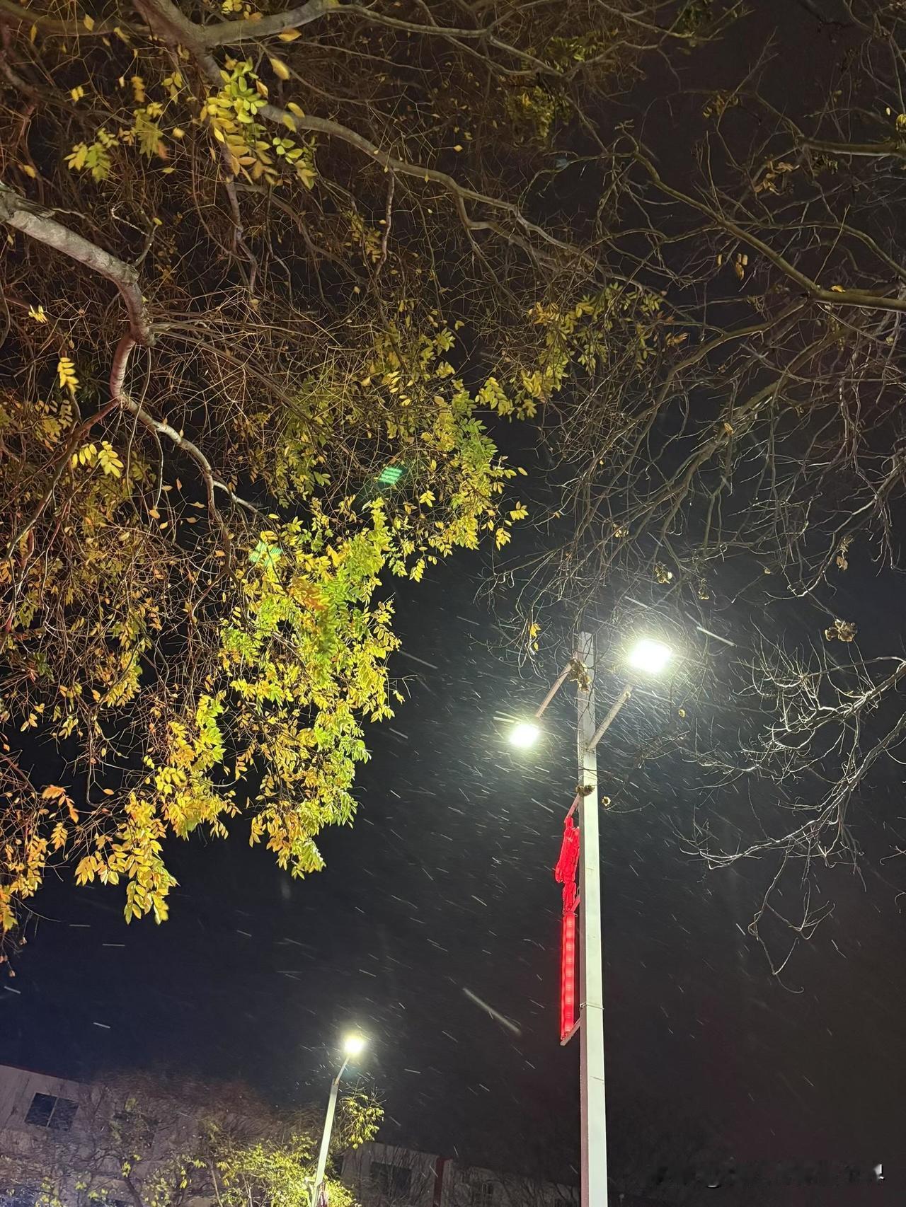 晚上出门,一抬头就撞见这有意思的画面——路灯亮堂堂地杵在那儿,细碎的雪沫子正慢悠悠往下飘,被灯光一照,像撒了把亮晶晶的糖霜。旁边的树还挂着些黄绿的叶子,枝桠歪歪扭扭地伸着,和光秃秃的枝子缠在一块儿,倒添了点烟火气。 雪不大,飘在脸上凉丝丝的,路灯的光晕裹着雪粒,晕出一圈温柔的光。站在这儿看了会儿,觉得冬天的夜晚也不是只有冷,还有这种细碎又可爱的小美好,随手拍下来,也算留住这瞬间的温柔了。