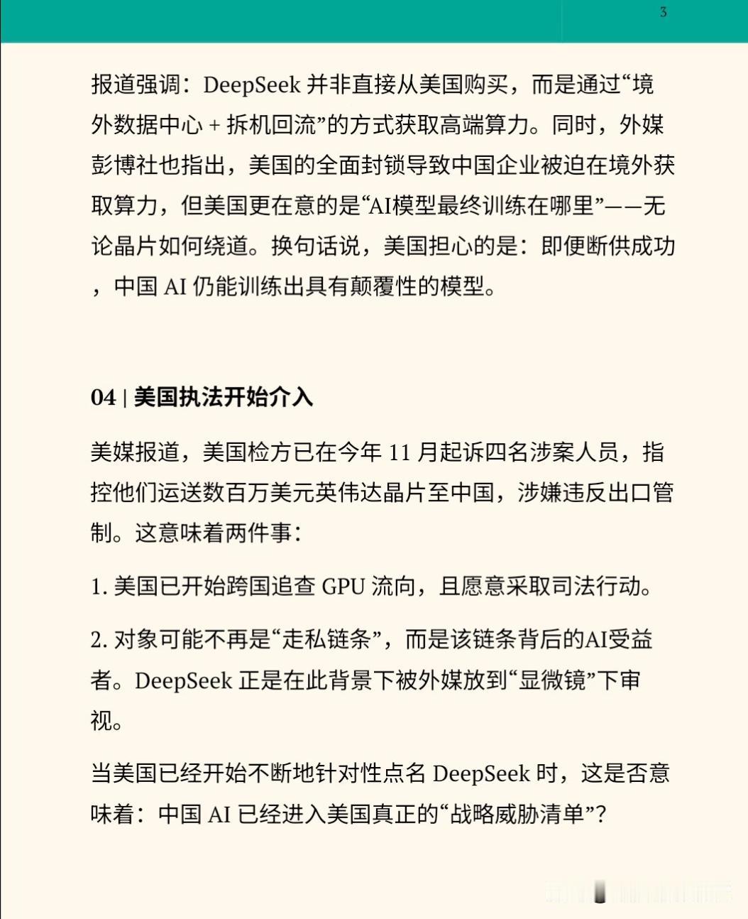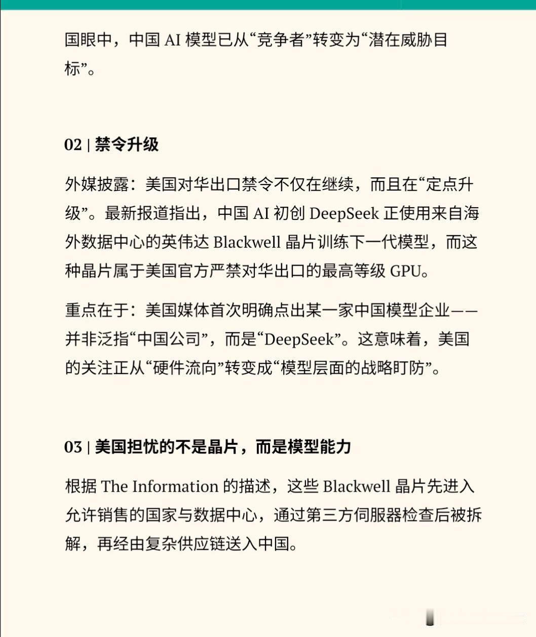 禁令升级?美国紧咬中国AI企业 封锁不再只是硬件层面的围堵,而开始指向具体的中国 AI 企业。据美媒 The Information 12月10日 最新报道,美国对华 AI 的出口封锁正在进一步升级。其中最受外媒关注的,是中国新锐 AI 企业 DeepSeek。 多家媒体报道,美国不仅继续禁止 Blackwell 等高端晶片进入中国,还将目光聚焦到这些晶片是否被用于训练中国的新一代大模型。