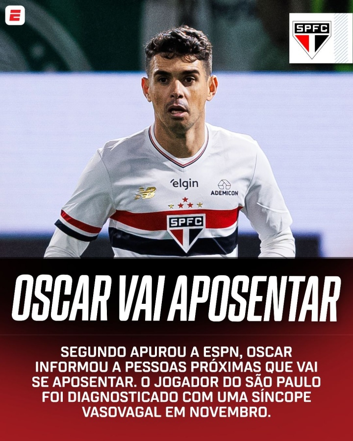 奥斯卡将退役 据ESPN报道,34岁巴西中场奥斯卡已经告诉身边亲近的人自己将会退役,并将与圣保罗俱乐部进行会晤。奥斯卡在11月体检时晕倒,并被诊断出患有血管迷走神经性晕厥。