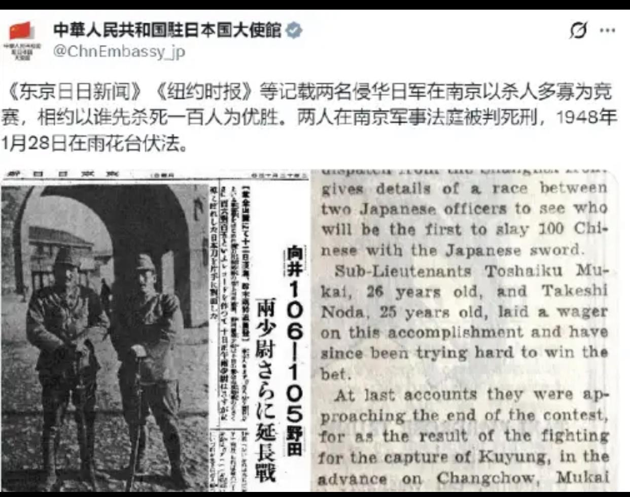 刚刷到驻日大使馆发布的资料, 我气得浑身发抖! 谁能想到,时隔这么多年,居然还有人敢抹黑南京大屠杀的史实,说“百人斩”是咱们编造的谣言! 当年日本《东京日日新闻》,可是大篇幅报道过两个日本兵的杀人比赛,白纸黑字写着他俩赌谁先砍够100个中国人;就连美国《纽约时报》,也转发过这条骇人听闻的新闻,国际社会都看在眼里。 更别提1948年,这两个双手沾满鲜血的刽子手,已经被远东国际军事法庭判处死刑,得到了应有的报应! 30多万南京同胞的冤魂,是刻在中华民族骨血里的伤痛。这种铁证如山的历史,我们怎么能忘,怎么敢忘? 那些睁着眼睛说瞎话的人,摸着自己的良心问问,真的能睡得安稳吗?大家都擦亮眼睛,别被歪理带偏,历史容不得半点篡改!