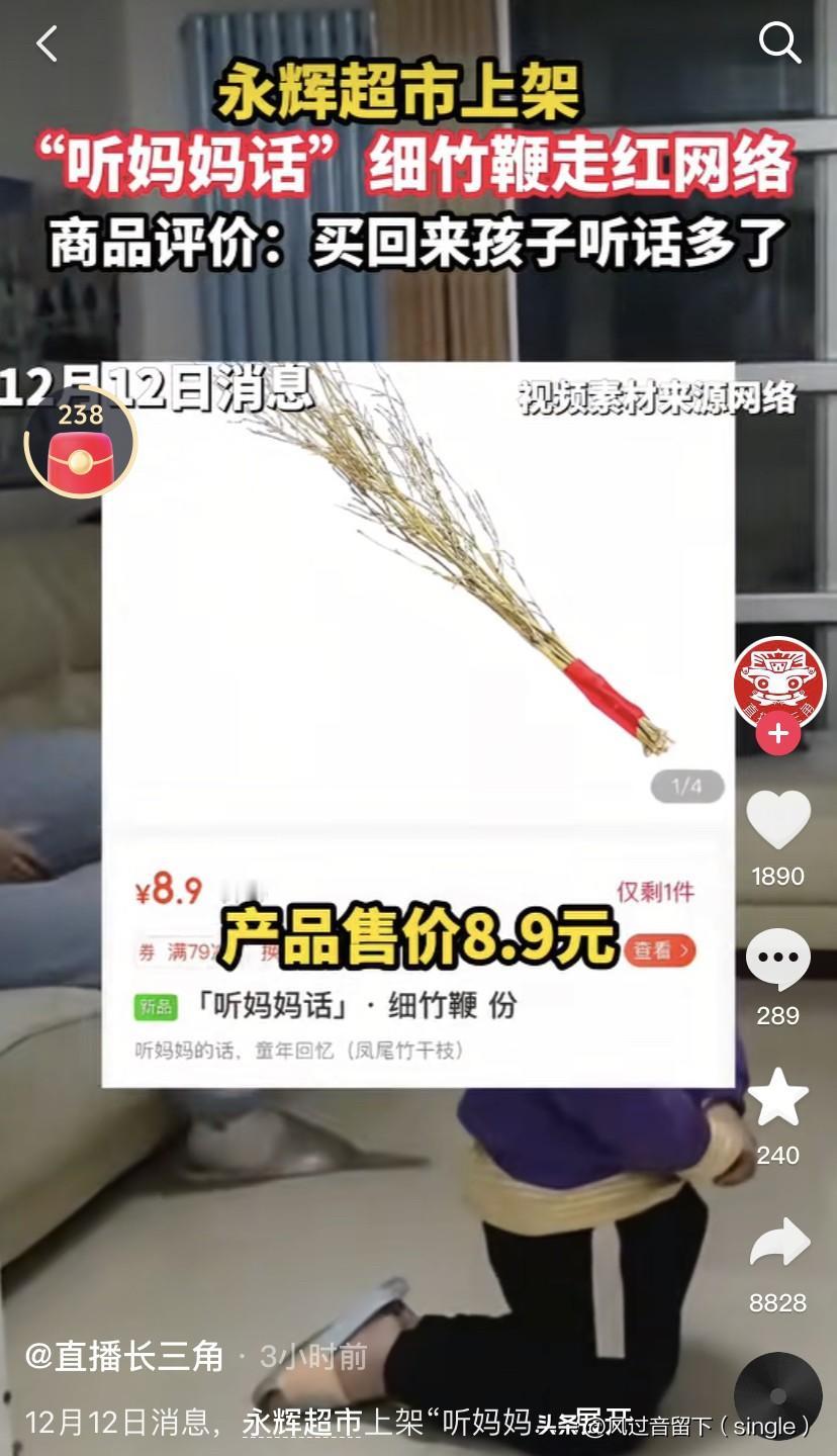 顺手就来的东西还可以高价卖! 永辉超市上架了一件产品:“听妈妈话”细竹鞭火了!有网友还说把这买回来,娃听话多了! 就一个这东西定价8.9元,感觉好贵啊! 我仔细一看:这不就是扫帚棍么! 就几个这用胶布缠起来就值8.9元,看来东西真的好贵! 有这钱,还不如去买一个大扫帚,随便在上面折,看能弄多少个这东西啊! 或者遇见清洁工了,让他给折几个,回去用胶布一缠,这不就好了么! 或者家里有烂扫帚,直接在上面折几根,胶布一缠,这也就好了! 就这还需要买?看来是商家发现商机,消费者还是有钱!