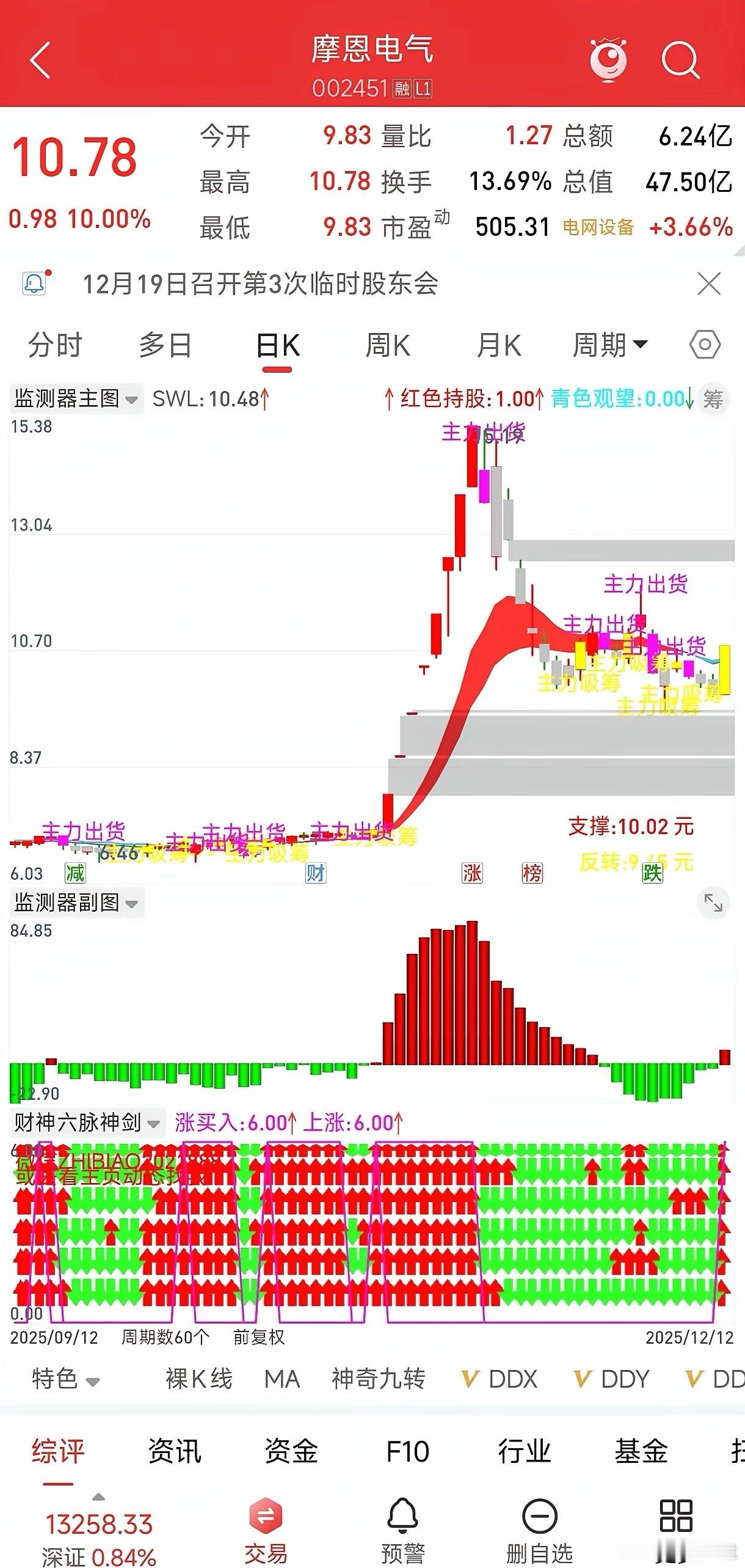 今日分享,下周关注今日主力资金呈流入状态,敢死队资金呈流入状态,多空资金呈流入状态,12月12日进入过资金榜TOP50。所属行业:输变电设备摩恩电气营业收入同比增长28.02%,资产负债率同比增长11.39%,每股收益同比减少40.30%,归母净利润同比减少40.00%,总资产周转率同比增长14.72%。近五日涨幅高于同行业公司0.87%,高于同期深证成指3.42%,高于同期OZ指数5.46%。筹码从高位向低位形成密集状态,当前股价10.78,+10.00%,高于支撑位7.00,低于压力位10.85;走势需进一步观察。