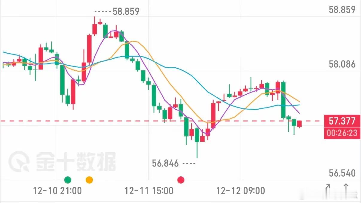 12.12原油晚间原油日线走势虽一度跌破前期联排支撑,但下跌力度明显减弱,价格在低位出现企稳迹象,短周期均线开始从下行转为走平,有逐步形成金叉的趋势,暗示短期有望迎来反弹修复。小时级别走势上,欧盘后虽跌破窄幅震荡区间,但随后迅速收回区间底部附近,空头动能未能持续扩大。K线开始企稳于短周期均线上方,小时图出现“下破不延续”的反转信号,短期走势由震荡偏弱转向震荡偏强。整体来看,原油在经历连续回调后风险已明显释放,短周期出现企稳与反转迹象,若晚间能突破日内压力位,将进一步打开反弹空间,短线可考虑低多思路为主。操作建议57.25-57.18附近哆,目标看57.6,57.9