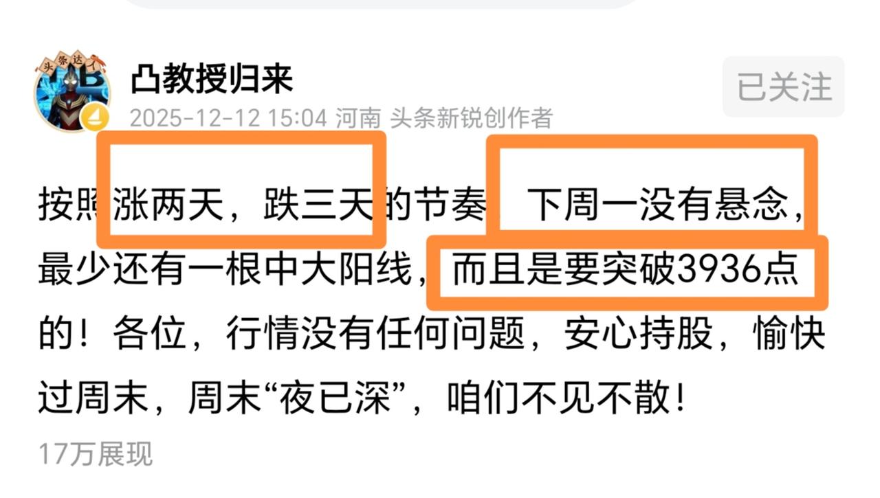 夜已深!凸教授深情发文,市场目前是按照跌三涨二模式推进的,今天涨了仅仅一天,说明下周一还要上涨,而且是收获一根中阳线,目标是3936点。凸教授安慰股民,市场没有一点问题,请股民放心过周末,准备迎接下周股市的反弹,并且约定不见不散!