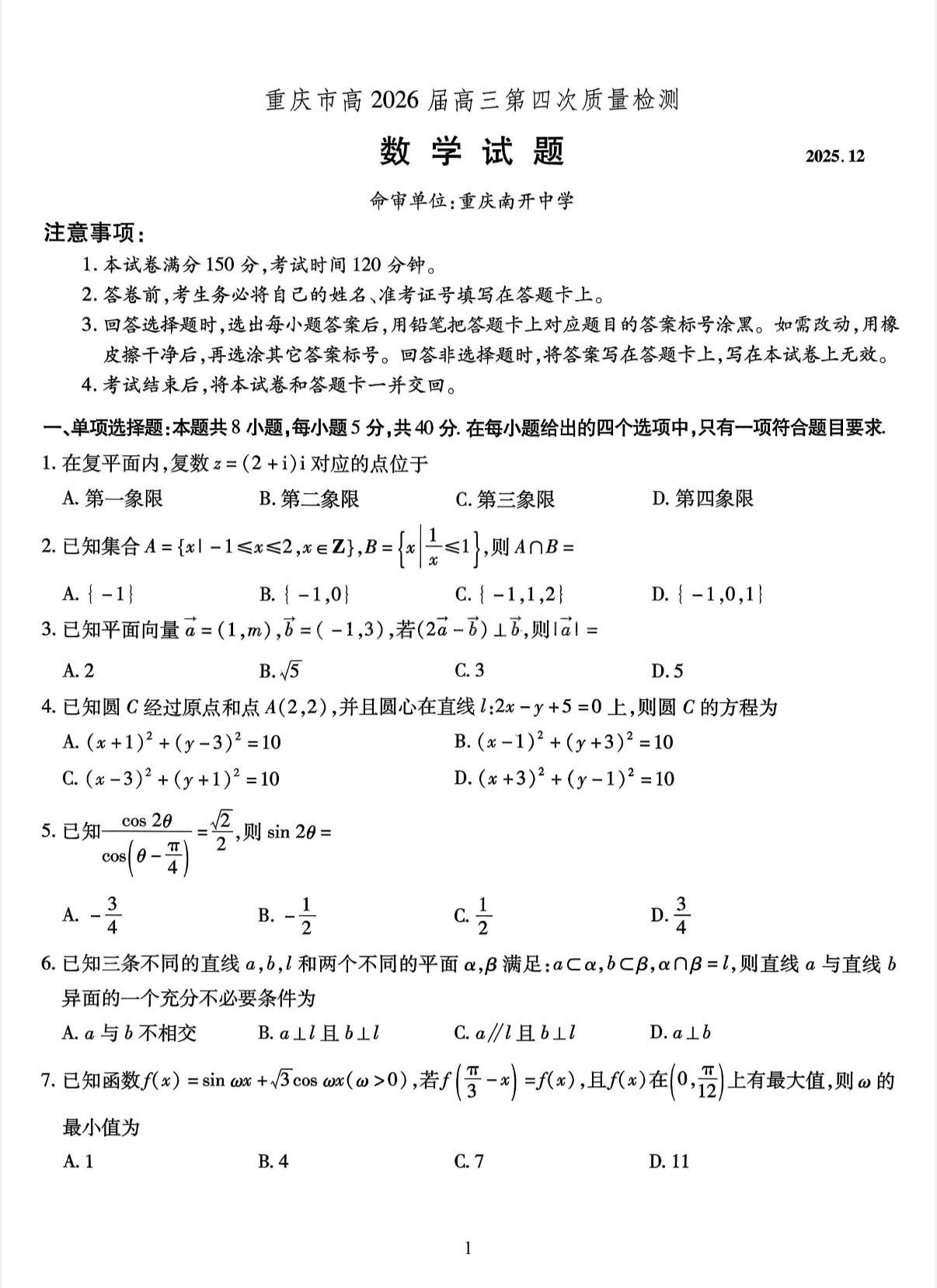 重庆七龙珠之南开中学2026届高三第四次月考数学试题及答案,该校今年高考清北52人!