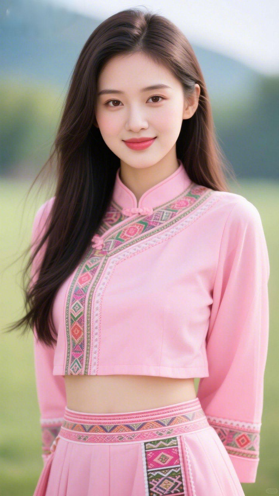 《粉衫裹满民俗春》 浅粉色的民族短衫沾着山野的软,衣襟处的彩绣将靛蓝、玫红的几何纹样织成鲜活的暖意,像把乡土里的烟火气缝进了衣料里。 长发轻垂肩头,身后朦胧的绿意衬着这抹粉,让民俗的纹样都浸着春日的舒展。你是否也遇过这样的温柔?是老手艺里藏着的鲜活色彩,是日常里撞见的传统温度,是把沉淀的民俗美,揉成了轻软的春日光景。 原来传统从不是沉闷的,一点鲜亮的底色,就能让老纹样透着轻盈的朝气。 民俗春衫的柔意 传统纹样的鲜活