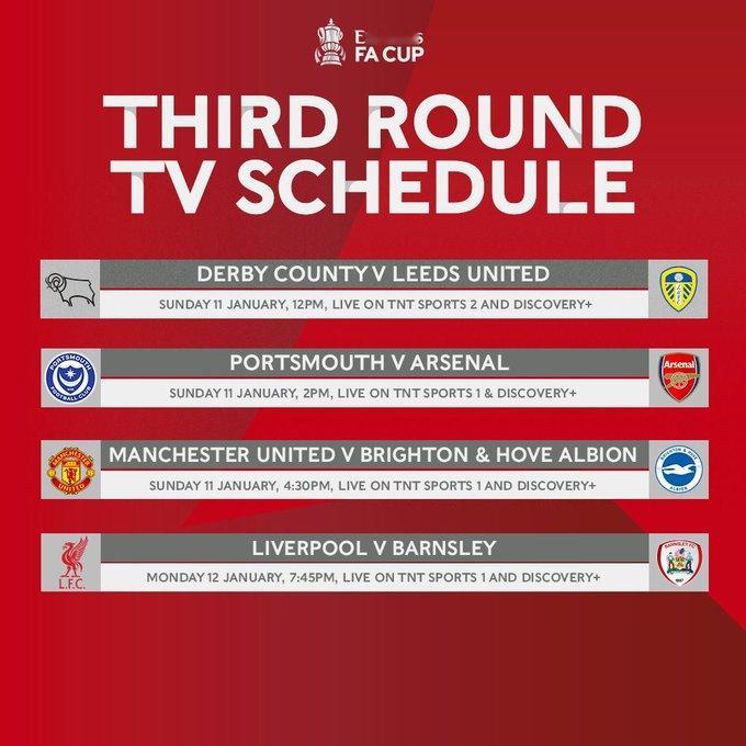 曼联与布莱顿的足总杯第三轮比赛将于英国时间1月11日周日下午4点半开球(北京时间1月12日凌晨12点半)