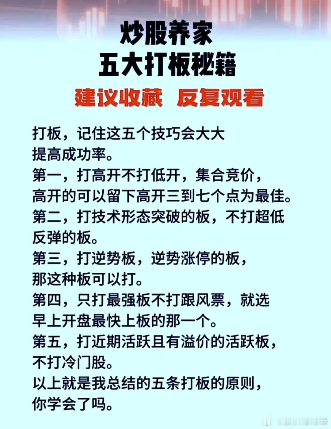 炒股养家五大打板秘籍打板,记住这五个技巧会大大提高成功率。第一,打高开不打低开,集合竞价,高开的可以留下高开三到七个点为最佳。第二,打技术形态突破的板,不打超低反弹的板。第三,打逆势板,逆势涨停的板,那这种板可以打。第四,只打最强板不打跟风票,就选早上开盘最快上板的那一个。第五,打近期活跃且有溢价的活跃板,不打冷门股。以上就是我总结的五条打板的原则,你学会了吗,我是股侠每日只分享最实用的短线炒股干货。作品声明:个人观点,仅供参考。金融股票财经知识分享官股票财经股票股市分析炒股技巧a股炒股