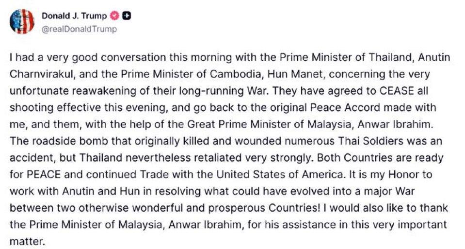 🇺🇸🇹🇭特朗普宣称停火协议取得胜利:泰国和柬埔寨同意停止边境枪击事件 特朗普发帖称,他与泰国总理阿努廷。查恩维拉库尔和柬埔寨总理洪玛奈进行了"非常好的"晨间谈话,并达成了一项协议,"从今晚起停止一切枪击事件". 他们应该恢复原先的和平协议,马来西亚总理安瓦尔。易卜拉欣在此过程中发挥了重要作用。 他称炸死泰国士兵的路边炸弹是"意外",并表示泰国进行了强力反击。 现在双方显然都渴望和平,继续与美国进行贸易,并避免这两个"繁荣"的邻国之间爆发"重大战争". 此前,持续数日的致命冲突破坏了特朗普斡旋达成的停火协议,造成数十人死亡,数十万人流离失所。 但泰国总理尚未确认是否已签署协议,他指出特朗普敦促各方保持冷静,但柬埔寨必须先采取行动。 如果维持下去,对该地区来说是巨大的解脱;如果失败,则将重回危机边缘。 来源:@realDonaldTrump,路透社,南华早报 🇺🇸🇹🇭🇺🇸🇹🇭 TRUMP CLAIMS CEASEFIRE WIN: THAILAND AND CAMBODIA AGREE TO HALT BORDER SHOOTING Trump posted about his "very good" morning chat with Thailand's PM Anutin Charnvirakul and Cambodia's PM Hun Manet, hashing out a deal to "cease all shooting effective this evening." They should revert to their original peace accord, with major props to Malaysia's PM Anwar Ibrahim for the assist. He called the roadside bomb that nailed Thai soldiers an "accident," said Thailand hit back hard. Now both sides are apparently pumped for peace, ongoing U.S. trade, and dodging what could've blown into a "major war" between these "prospering" neighbors. This comes after days of deadly clashes that wrecked a prior Trump-brokered truce, killing dozens and displacing hundreds of thousands. But Thailand's PM hasn't confirmed a signed deal yet, noting Trump pushed for calm, but Cambodia's gotta act first. If it sticks, huge relief for the region; if not, back to the brink. Source: @realDonaldTrump, Reuters, SCMP