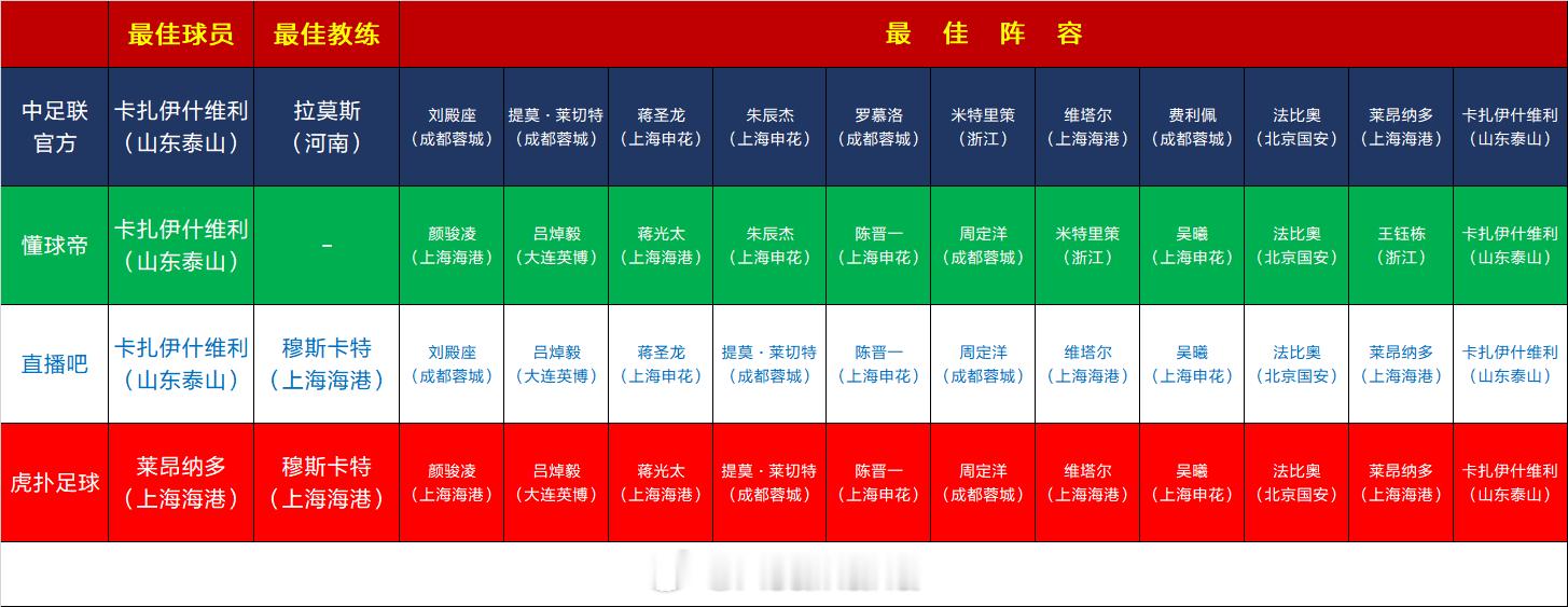 官方和三个媒体平台 评选的2025中超最佳球员(MVP)、最佳教练和最佳11人阵容对比。