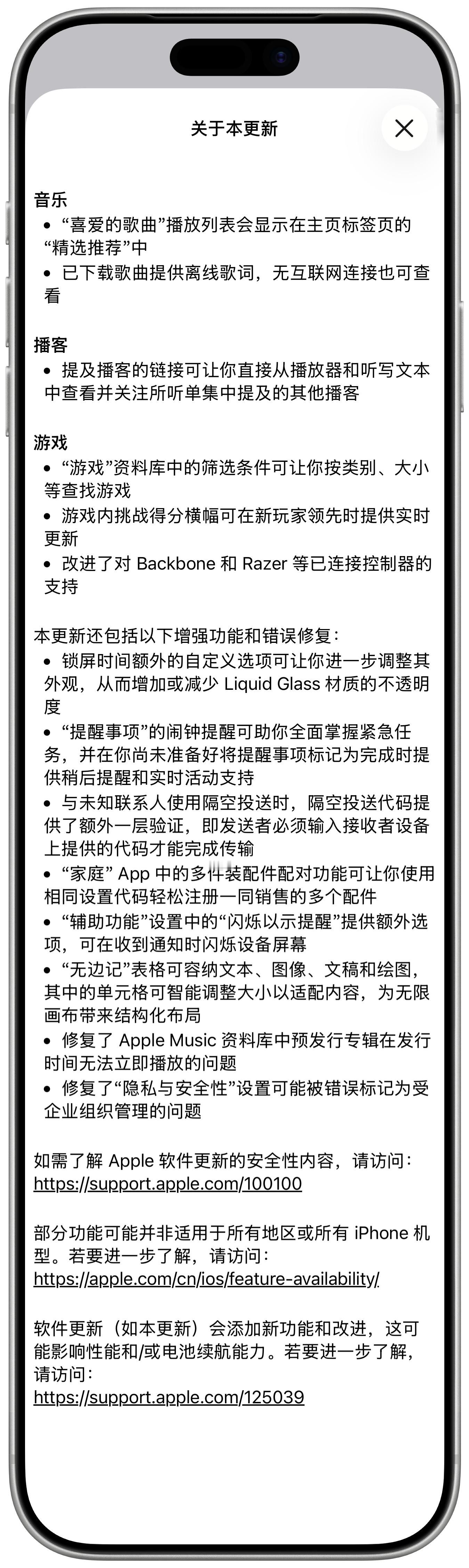 苹果 iOS 26.2正式版来咯本更新为“音乐”、“播客”和“游戏”带来了增强功能,同时包括针对 iPhone 的其他功能、错误修复和安全性更新。详细更新日志看图二⚙️iOS26.2iPhone17