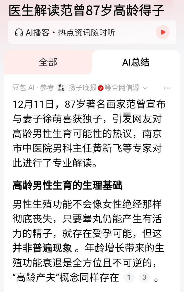 87岁还能生孩子吗? 当然能,比如范曾老爷子,刚刚宣布老来得子,他与37岁的娇妻,刚刚生了一个儿子,可喜可贺! 为什么杨振宁老爷子82岁结婚,没有孩子呢? 医生说了,这并非普遍现象, 总而言之,这确实是让人幸福的一件事。