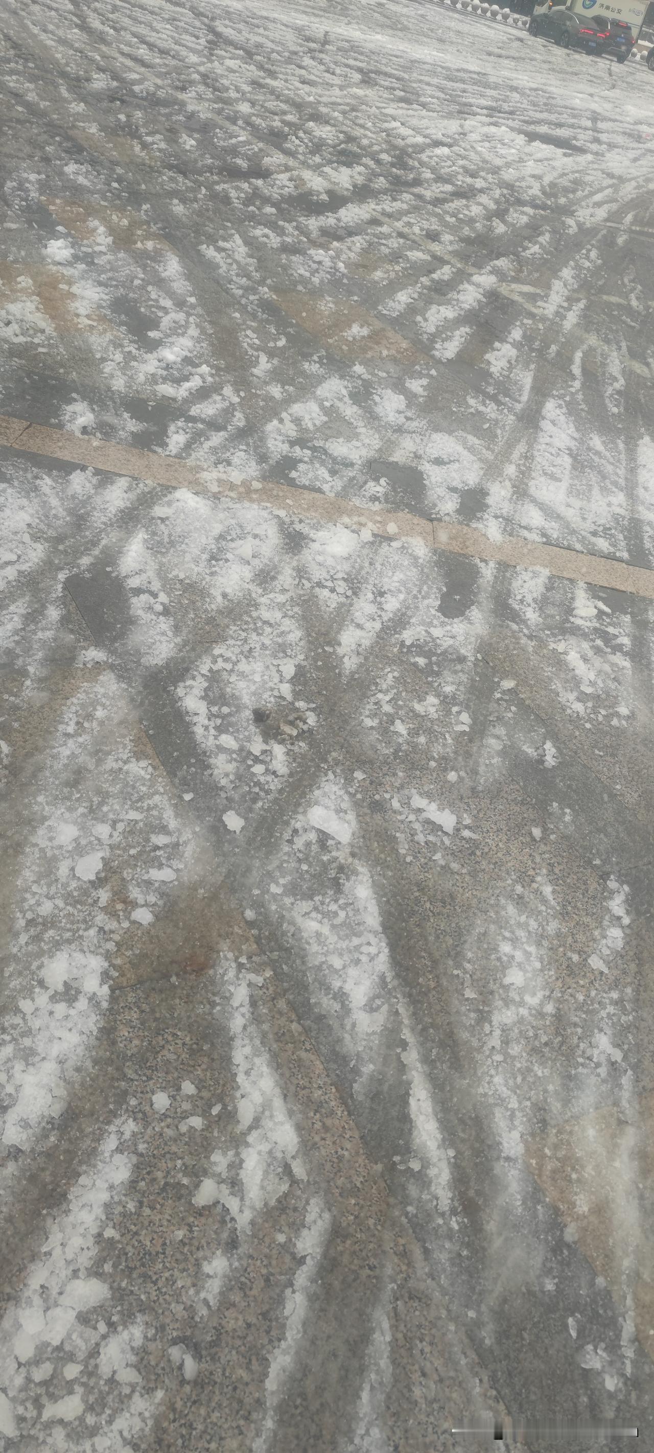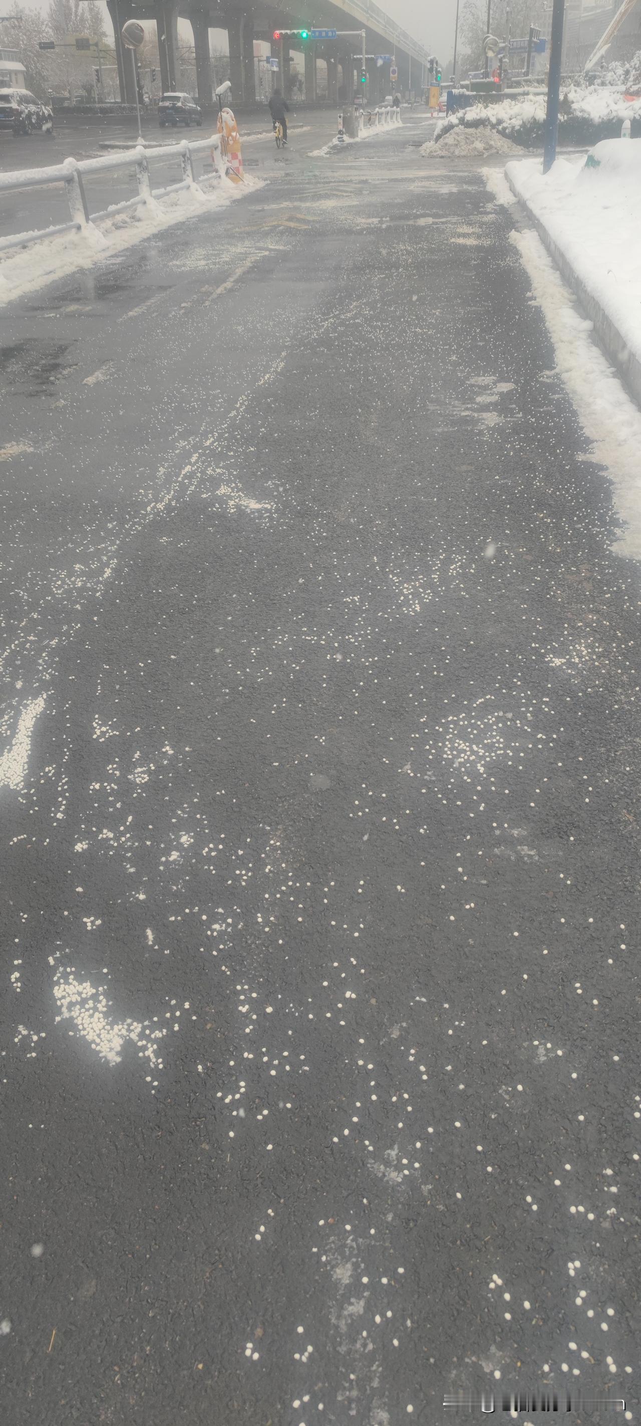 下雪之后, 撒过融雪剂的人行道和没撒融雪剂的人行道 图一那些小颗粒是溶雪剂 图二没撒融雪剂,都结成块,结成冰了。