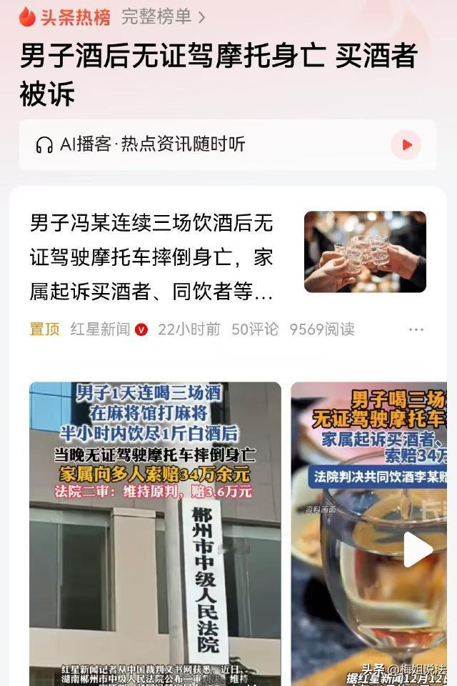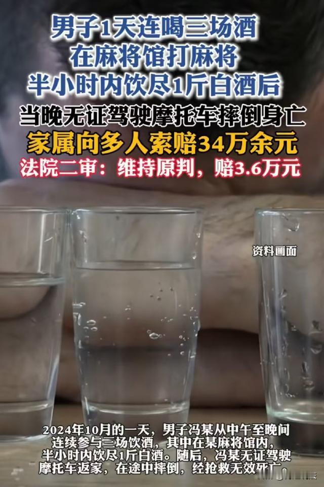 湖南郴州,男子中午才吃完丧宴,晚上又和人一起喝酒,晚饭后去打麻将又喝了一斤白酒,一共喝了三场,晚上冯某无证驾驶摩托车摔倒不幸身亡。案发后,冯某家属起诉给冯某买酒的熟人、麻将馆老板以及和他一起喝酒的人等,索赔34万余元。 据红星新闻、等报道,2024年10月1日中午,冯某去吃了一顿丧宴,宴席上,冯某喝了大约4两白酒。 晚上,冯某又和几个朋友相约去某饭店吃饭喝酒,席间,冯某等四人一起喝了两斤52度的白酒。 吃完饭,已经快八点了,冯某牌瘾犯了,于是骑着摩托车去肖某的麻将馆打麻将。 9点钟左右,冯某正在玩牌,老朋友李某走了进来,看到冯某后,李某赶紧和他打起了招呼,还约他有空一起喝酒。 冯某当天高兴,因为一局牌没打完,便掏出100块钱,递给旁边看牌的刘某,让刘某帮他去买酒。 刘某买了两瓶二锅头,冯某和李某一人一瓶。因没有下酒菜,两人一边打牌一边干喝了起来,大约半小时后,两人都喝完了。 10点左右,冯某从牌桌上起来,站在一边看其他人打,看了一阵,冯某觉得有点困,便告别李某,自己骑上摩托车回家了。 谁知,冯某刚离开麻将馆200米,就在一个转盘边摔了一跤,路人发现后将冯某送去救治,但凌晨1点20分,冯某还是离世了。 冯某离世后,家属没有做尸检,也没有进行酒精度检测。 后经调查,冯某未取得摩托车驾驶证。 案发后,冯某的家属起诉麻将馆老板肖某、给冯某买酒的看牌人刘某以及和冯某一起喝酒的李某等人,要求他们共同赔偿34万余元。 一审认为,首先,冯某作为具有完全民事行为能力的成年人,应当具备对自身行为和可能产生后果的认知能力。 冯某在一天内连续参与三场饮酒活动,且在未取得摩托车驾驶证的情况下,饮酒后驾驶摩托车,这一系列行为严重违反了交通法规和基本的安全常识。 根据《民法典》第1173条规定:被侵权人对同一损害的发生或者扩大有过错的,可以减轻侵权人的责任。 冯某的自身过错是导致其死亡的主要原因,他的鲁莽行为本质上是对自己生命安全的漠视,所以他应对自己的死亡承担主要责任。 其次,刘某受冯某委托帮忙购买白酒,这属于典型的委托代理行为。 依据《民法典》第929条规定:有偿的委托合同,因受托人的过错造成委托人损失的,委托人可以请求赔偿损失;无偿的委托合同,因受托人的故意或者重大过失造成委托人损失的,委托人可以请求赔偿损失。 刘某帮冯某买酒是无偿的,并且从案件情况来看,他无法预见冯某饮酒后会发生死亡的结果,不存在故意或重大过失。 所以,刘某与冯某的死亡没有法律上的因果关系,不承担赔偿责任。 另外,肖某作为麻将馆的经营者,对前来打麻将的顾客有法定的安全保障义务。 《民法典》第1198条规定:宾馆、商场、银行、车站、机场、体育场馆、娱乐场所等经营场所、公共场所的经营者、管理者或者群众性活动的组织者,未尽到安全保障义务,造成他人损害的,应当承担侵权责任。 但是,肖某并未与冯某一起饮酒,冯某的死亡也并非发生在麻将馆内,而是在其离开200米处的转盘边。 从合理限度原则来看,肖某对于冯某离开麻将馆后的驾驶安全难以进行有效管控,其死亡已超出肖某合理限度范围内的安全保障义务,因此肖某不应承担赔偿责任。 最后,李某与冯某一同饮酒,在共同饮酒过程中形成了特定的民事法律关系,共同饮酒人之间负有一定的注意和保护义务。 虽然法律没有明确详细规定此类义务,但依据公序良俗和诚实信用原则,李某应当对冯某的过度饮酒行为进行适当劝阻。 当冯某饮酒后准备骑摩托车离开时,李某更有义务阻止其危险驾驶行为。 根据《民法典》第1165条规定:行为人因过错侵害他人民事权益造成损害的,应当承担侵权责任。 李某未尽到必要的注意义务,对冯某的死亡存在一定过错,所以需要承担部分赔偿责任。 最终,一审认为,冯某应承担阿凡达的主要责任,李某对本案承担3%责任,赔偿冯某家属3.6万余元,刘某和肖某不承担责任。 一审判决后,冯某家属不服上诉,二审维持原判。