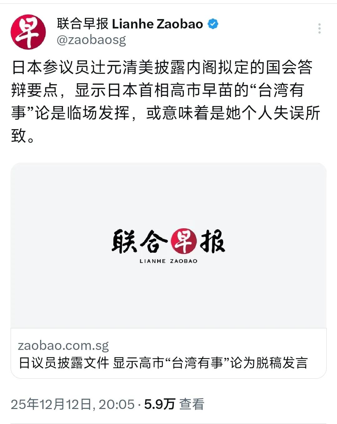 新加坡联合早报昨晚(12月12日)报道:“日本参议员辻元清美披露内阁拟定的答辩要点,显示日本首相高市早苗的‘台湾有事’论是临场发挥,或意味着是她个人失误所致。” 一国首相胡言乱语又不代表该国政府立场,简直就是世纪笑话,日本政府官房的言论越描越黑。实际情况则是美国国防部负责战略的副部长埃布里奇.柯尔比在年初与日韩澳三国国防官员会谈时,提出“如果台海有事”三国应该怎么办的问题,遭到石破茂政府的拒绝回答。高市早苗上任后,为提高支持率的一己之私,说出了美国想说而不敢说的话,但高市发表涉台错误言论后,没有得到美国官方的公开支持而又感到极度失望。