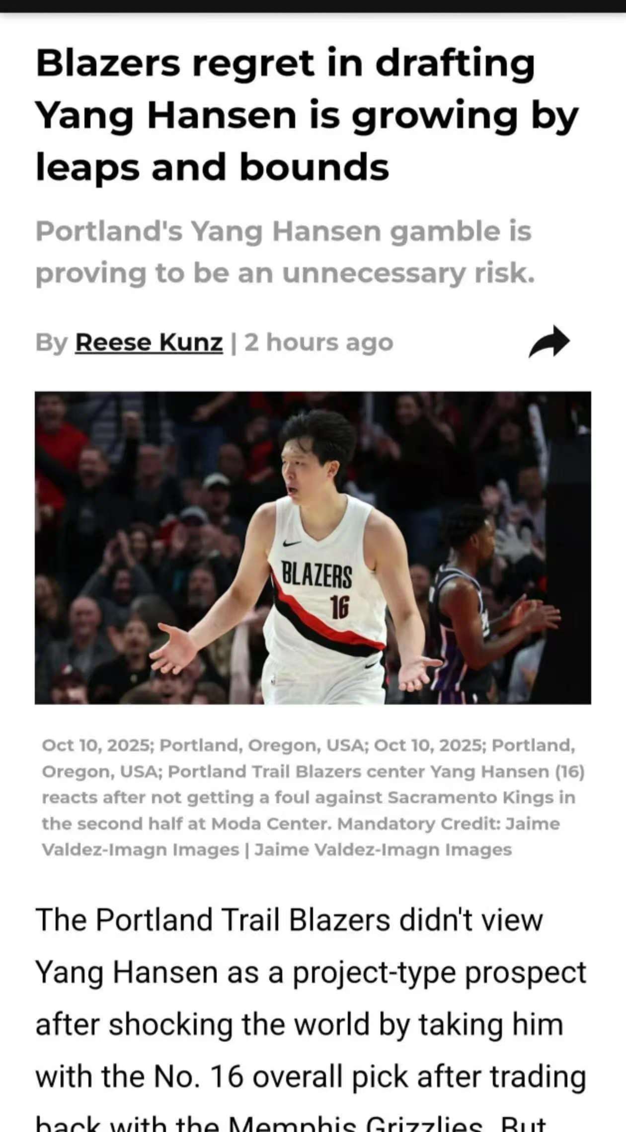 作为新秀球员,杨瀚森在开拓者队的菜鸟赛季过得并不顺畅,目前场均只有2.6分1.8篮板0.8助攻,场均命中率30%,三分球命中率更是只有6.3%。 随着赛程不断推进,人们对于杨瀚森能否立足NBA也产生了质疑。开拓者当地已经有很多声音出现,表示当时开拓者如果没有选择杨瀚森,选到考沃德或者奎因其中的一位,现在也就不用那么纠结。 最近更是有杨瀚森可能被交易的流言传出,起因是杨瀚森在和灰熊队的比赛之后,缺席了发展联盟的比赛,而在最近一场NBA比赛中,球队又以伤病为由,使得杨瀚森缺席了比赛。 对此有球迷则表示,开拓者很可能在酝酿大交易,即便他们没有将杨瀚森放入筹码之中,但如果对方要求,杨瀚森也不是开拓者队不可能出手的球员。 大家认为,中期交易的时候,开拓者会交易瀚森吗?