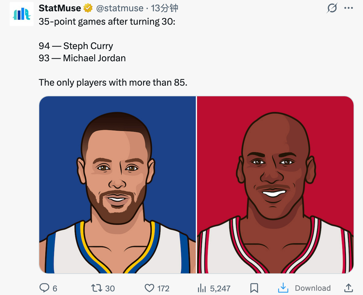 30岁之后35+场次,库里超越乔丹,库里94次,乔丹93次森林狼战胜勇士库里复出