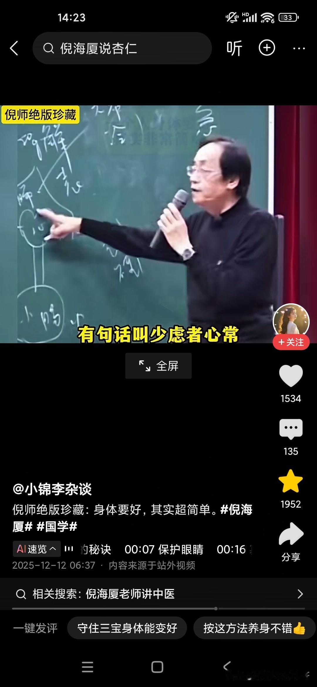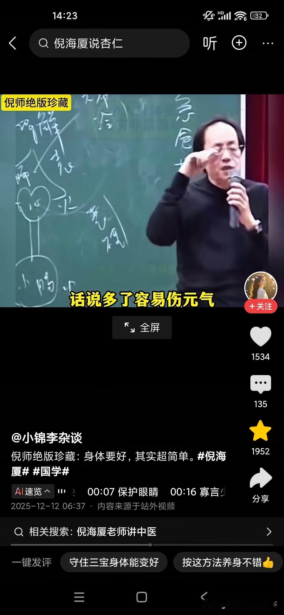 倪海厦老师说人要想长寿,必须要守住我们人体的三个宝贝: 第一个是守护我们的眼睛,不要用眼过度,因为眼睛代表了一个人的精气神,如果用眼过度的话,就看起来完全没有精神,你如果看一个人有没有灵气,就看他的眼神,眼睛是人心灵的窗户; 第二点的话是说话不要太多,我们看一看这些经常说话过多的,像教师群体,医生群体或者客服群体,他们都把自己的唾沫以及津液都快使用完了,所以说每天回来去的话,几乎是话都不想说,几乎是精疲力尽,这种人也这种类型和行业的人群也是容易生病,体质比较差的一个群体; 第三个是心要保持安静,不要为各种各样的事情去思虑,因为你在市里他可能也改变不了现状,你可以心里有这个弦,但是没有必要总是被各种事情所烦恼,关键是要心大,神经粗,这样的人才能活得长久!