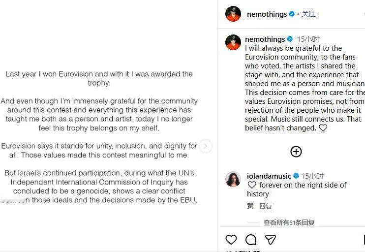 当着欧洲众人的面,瑞士冠军把奖杯退回去了!这下以色列要尴尬了 2024年欧洲歌唱大赛冠军、瑞士歌手尼莫把奖杯往箱子里一塞,宣布要寄回给主办方。 这波操作直接把原本就争议不断的欧歌赛推上风口浪尖,更让被抗议的以色列陷入了尴尬境地。 欧歌赛可是欧洲顶流的音乐盛典,全球有1.6亿观众盯着,尼莫这一举动,相当于在全世界面前给了赛事方和以色列一记响亮的表态。 可能有人还不清楚来龙去脉,咱先把时间线理清楚。尼莫不是一时冲动,这事儿得从2026年欧歌赛的参赛资格说起。 作为运营方的欧洲广播联盟,12月初刚拍板决定不就以色列的参赛资格投票,相当于直接给以色列开了绿灯,允许他们参加明年在维也纳举办的比赛。 这个决定一出来,欧洲立马炸了锅,西班牙、荷兰、爱尔兰、斯洛文尼亚先一步宣布抵制,紧接着冰岛也加入了抵制阵营,短短几天就凑齐了五个“罢赛”国家。 而尼莫的退杯,就是这波抗议潮里最重磅的一击。 这位26岁的歌手不简单,去年凭借歌曲《The Code》夺冠时,成为了欧歌赛历史上首位非二元性别冠军,这首歌讲述的是他确认自身身份的经历,本身就和欧歌赛倡导的“团结、包容、尊严”理念高度契合。也正因如此,他的抗议才更有分量。 在Instagram发布的视频里,尼莫拿起那座标志性的麦克风造型水晶奖杯,语气坚定地说,现在觉得这个奖杯不再适合放在自己的书架上了。 他直言,欧歌赛一直标榜的价值观,和允许以色列参赛的决定完全相悖,尤其是联合国独立调查委员会都已经认定以色列在加沙的行动构成种族灭绝,赛事方还睁一只眼闭一只眼,这就是把理想和现实割裂开了。 尼莫特别强调,自己的抗议不针对任何个人或艺术家,而是看不惯欧歌赛被当成“洗白工具”——用一场音乐盛典,去软化一个被指控犯有严重罪行的国家的形象。说着他就把奖杯放进箱子,明确表示要寄回位于日内瓦的欧洲广播联盟总部。 毕竟加沙的人道主义危机摆在那儿,当地卫生部门的数据显示,自2023年10月巴以冲突升级以来,已有超过7万名巴勒斯坦人在以色列的军事行动中丧生,这样的背景下,让以色列继续站在号称“包容和平”的音乐舞台上,确实让不少人觉得难以接受。 面对这波抗议,各方的反应也截然不同。欧洲广播联盟的执行董事马丁·格林只能无奈回应,说对尼莫的决定感到遗憾,但尊重他的观点,还得硬撑着说尼莫是“赛事大家庭受重视的一员”。 而以色列方面则把能继续参赛当成“胜利”,总统赫尔佐格还专门表示欢迎,声称这是对试图让以色列“噤声、边缘化”的反击。 德国等国却站在以色列这边,德国总理默茨之前就放话,要是以色列被禁止参赛,德国也会退出。 今年5月的欧歌赛就已经出现过投票争议,有国家指控以色列政府游说海外公众投票影响结果,后来赛事方只能修改规则。 原本大家以为规则改了会重新评估以色列的参赛资格,没想到赛事方直接跳过投票环节,这才引发了大规模抗议。 尼莫也提到,自己去年比赛时就感到很孤立,主办方没给深陷争议的参赛者足够支持,如今看来,当时的矛盾早就埋下了种子。 现在距离2026年欧歌赛还有几个月时间,原本这届赛事是70周年庆典,本该热热闹闹办一场,结果现在被抵制潮搞得一地鸡毛。 尼莫在视频里最后说的那句话很戳人:“如果舞台上歌颂的价值观,在舞台下无法践行,再动听的歌也毫无意义。” 这句话不仅是说给赛事方听的,也让大家重新思考,当艺术遇上地缘政治,到底该如何坚守初心。而以色列这边,就算拿到了参赛资格,面对全欧洲的抗议声和退赛潮,这场比赛恐怕也很难安心参与,这份“胜利”背后,全是抹不去的尴尬。