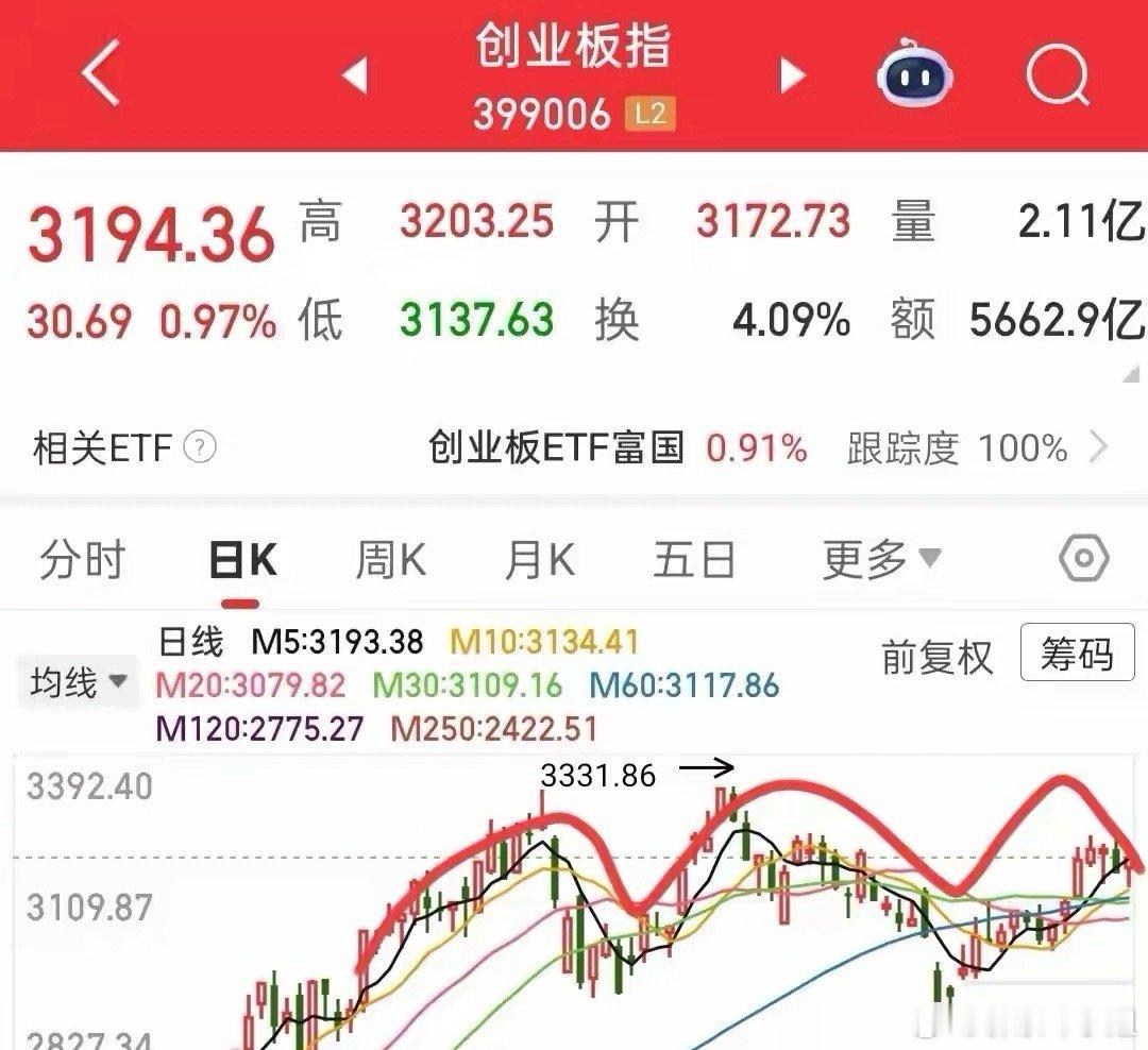 耐心等待回踩120日线最近大家比较关心的问题,到底什么时候会回踩120日线,都快要等不及了!如果你不擅长做短线踩节奏,那就耐心等,近期的市场的操作难度,以肉眼可见的速度在增加,现在入场就是逆流而上,尤其大盘震荡期间,卧倒只会亏钱,所有的拉升,都是陷阱!卧倒只适合两种模式一、主升浪二、连续急跌后的修复目前的市场都不符合这两种,所以不能卧倒,那么我们还是看引领市场走牛的创业板我们仔细去看它,如果单单只看近期的形态,确实很强,强到没朋友,这种明显符合十日线趋势玩法,如果没有消息刺激,这种形态还会继续上涨的,但是外围昨天大科技普跌,那么短期内创业板会走几天的上下巨震,怎么理解,就像这样如果我们把创业板缩小,去看它的整体形态,就能发现,已经在做多重顶了,吓不吓人?所以时间拉长一些,创业板就要回踩到120日线,看到这里,希望你们能做好应对,要谨慎一些了,这次一旦下跌,就不是几十个点的事了,大概就是这样,红色方框处现在就看上证,全A,创业板谁先回踩120日线了,如果本着先回调先反弹的原则,我们排个先后顺序全A>创业板>上证!现在我们关心的是全A下周上半周能否再次站上60日线,如果站不上,那就没跑了,准备迎接120日线吧!!