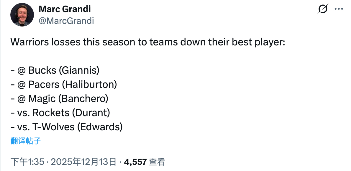 勇士已经输了五场对方当家球星缺席的比赛,呱唧呱唧!森林狼战胜勇士