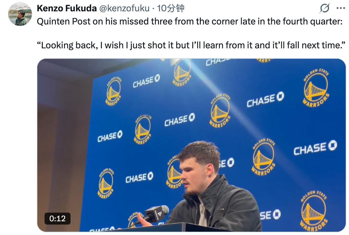 波斯特谈到他在第四节末段错失的底角三分球时说:“回想起来,我真希望当时直接投了,但我会从中吸取教训,下次它会进的。”森林狼战胜勇士