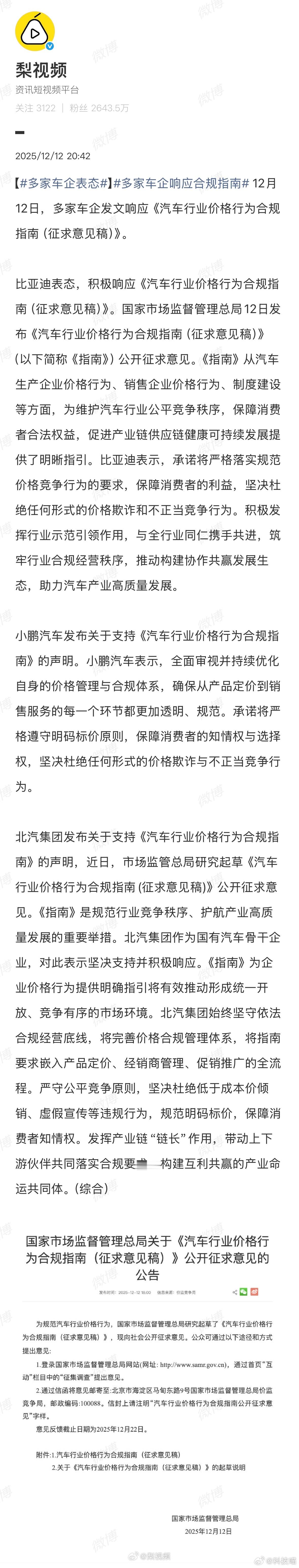多家车企表态太好了,希望不要内卷太厉害了,价格战打得过于厉害,影响汽车行业健康比如汽车降价一个比一个狠的话,会导致不少人有观望情绪,就是等等党