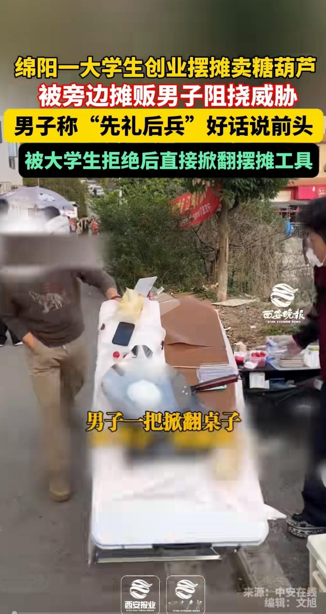 摆摊还要规矩?四川,一大学生创业摆摊卖糖葫芦,不料旁边的摊贩气势汹汹走过来进行阻挠,说:“你今天摆了就别摆了,我今天先礼后兵”,大学生不予理会,摊贩直接怒气一上头,将大学生的糖葫芦给掀了 大学生创业不容易,这位大哥属实是有点过分了,各凭本事摆摊,也不存在影响自己生意的说法,不过这下大学生可以提前收摊回家了