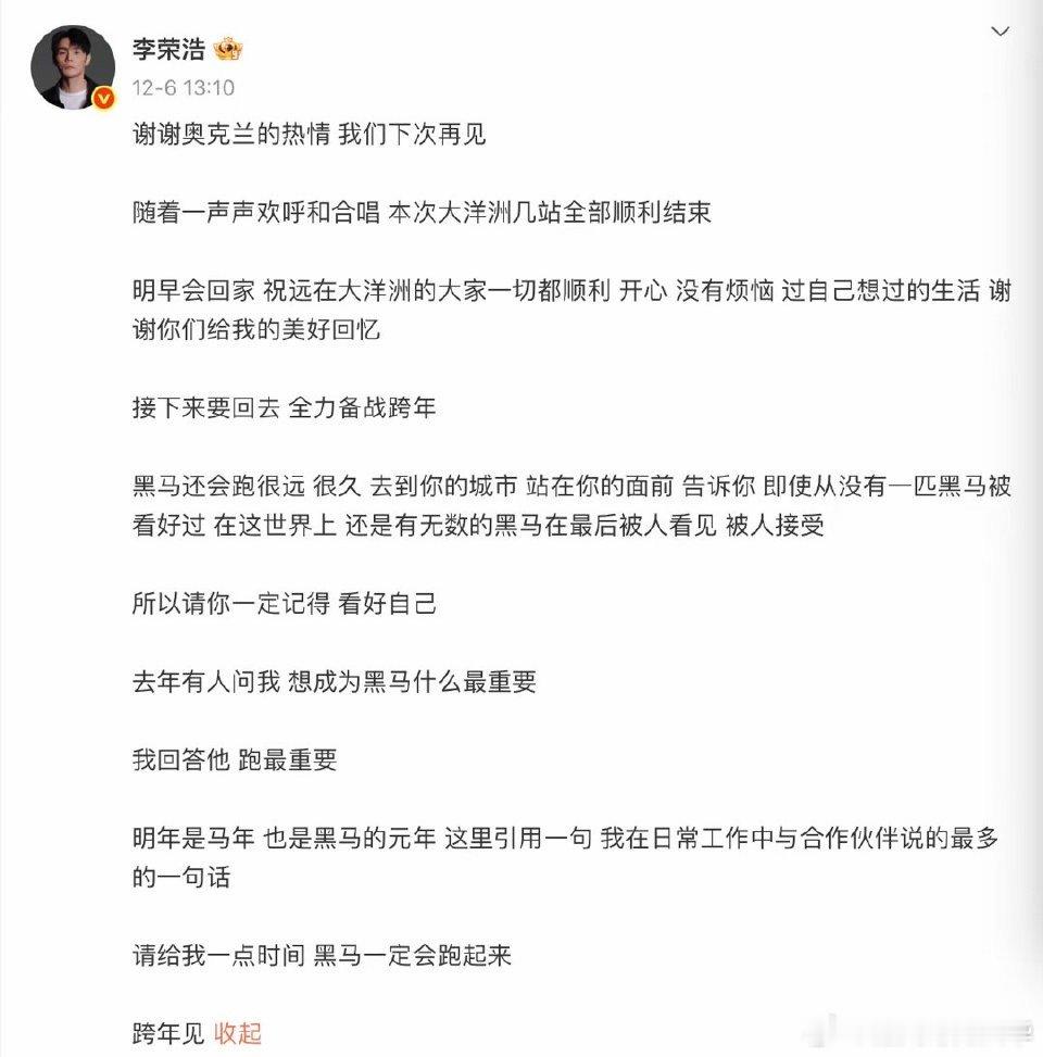 李荣浩 浪漫疯子李荣浩不愧是浪漫疯子!兑现承诺官宣2026黑马巡回20城演唱会,默默筹备不负期待,用歌声传递初心与热爱,这份藏在细节里的浪漫,直接狠狠心动!
