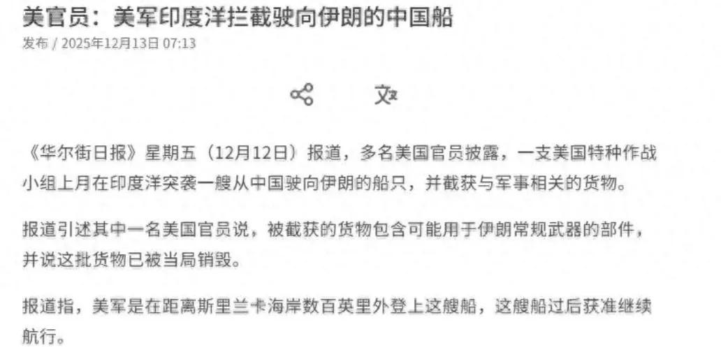 美军公海拦中国货船,没证据没授权就登船毁货,这哪是执法,分明是 霸权式海盗行径! 美方拿“涉伊朗军事物资”当借口,却拿不出实锤证据,完全违反《联合国海洋法公约》。这种单边制裁凌驾于国际法之上的操作,彻底暴露了“顺我者昌逆我者亡”的真面目。 台湾是中国领土,美国往台湾运军火,本质是破坏中国主权的违法行径。既然美国开了“随意拦船”的坏头,我们更有正当理由反制——中国海军依法享有登临权,对运往台湾的非法军火船,完全有权登船检查、扣押销毁。 这不是效仿霸权,而是用合法手段捍卫核心利益。霸权横行的时代早该过去,谁也不能拿别人的主权当儿戏。你觉得该如何精准反制这种海上霸凌?