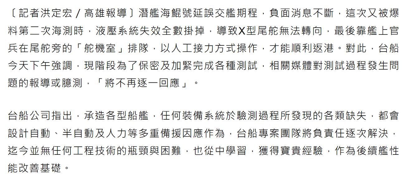 🔻台湾造船厂称不再回应海鲲潜艇的负面新闻。🔻近日,台湾自造海鲲潜艇又被爆出在今年试航中出现操舵系统严重故障,液压系统瘫痪,导致潜艇无法转向,最终只能让船上台军人力一个个用手摇舵面完成转向,勉强拖回港口。每天认识一件兵器