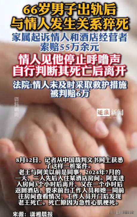 广西,66岁男子约情人在酒店见面,俩人发生关系后休息,情人睡醒,发现身旁男子没了动静,喊也没回应,判断男子已经没气了,匆忙离开酒店,一个多小时后,女子又返回,还带着工作人员查看男子的情况,此时男子已离世多时。事后,男子的家属把女子告上法庭,索赔55万,女子辩称自己当时没睡醒,不知道男子的情况,回家是为吃降压的药。最终法院判了。 一场迟到的黄昏恋,一场隐秘的酒店之约,最终却以令人唏嘘的方式收场。这不仅仅是关于背叛或情感的纠葛,更是一次关于人性本能与法律底线发生激烈碰撞的“教科书式”悲剧。当枕边人突然在这封闭的空间里没了声息,留下的那一方,究竟该先顾全自己的“清白”,还是该不论代价地挽救生命?广西出现的这起案件,把这个令人揪心的问题摆上了台面。 这一切的开端,始于 2023 年。66岁的退休老汉王某,日子过得安逸却总觉得缺了点滋味。虽到了含饴弄孙的年纪,但他心里的火苗还没灭,一来二去,竟联系上了昔日的老同事阿美。据说他俩早年关系匪浅,就差临门一脚,便能将那份情愫化作相守的缘分。隔着几十年的光阴重逢,这份旧情复燃得格外猛烈,微信里那是越聊越投机,仿佛找回了青春的悸动。 到了2024年7月,光在手机上聊已经解不了渴,两人顺理成章地约在了酒店线下见面。久别重逢的干柴烈火,让气氛在私密的空间里迅速升温,随即便发生了亲密关系。一切看起来似乎只是两个成年人的私密韵事,可谁也没想到,命运的齿轮在这一刻卡住了。 激情的余温还没散尽,疲惫已悄然涌至,两人先后沉沉睡去。当阿美从睡梦中苏醒,一场意料之外的状况已悄然发生。因为觉浅,她没睡多久就迷迷糊糊睁开了眼。下意识往旁边一瞧,不对劲——王某安静得有些过分了。她试探性地伸手推了推,甚至喊了两声,对方毫无反应,甚至大腿上隐约可见的一块黑斑更是让她心惊肉跳。这一刻,恐惧瞬间击穿了理智,她意识到这个昔日的恋人可能已经“没了”。 在这生与死的关头,阿美的选择成了后续官司争议的暴风眼。按理说,不管是作为旧相识还是当下的伴侣,第一反应都该是求救。打个120,或者喊前台,哪怕人真的救不回来了,这也是尽人事。但阿美没有。巨大的恐慌加上这种关系见不得光的心理压力,让她只想逃离这个“是非之地”。她匆匆穿好衣服,竟然就把已经毫无知觉的王某独自留在了房间,头也不回地离开了酒店。 这一个多钟头里,阿美回了次家。她在庭审中称,此次返程是为了服用降压药。她说当时自己刚睡醒,脑子也是蒙的,心里除了害怕什么都不剩。可无论理由多充分,冷静下来的她还是明白,这事躲不过去。于是在离去良久后,她又硬着头皮返回酒店,这回才拉上了工作人员一起推开了那扇房门。可惜奇迹并未降临,工作人员核实后确认,王某早已离世。 阿美在法庭上也满腹委屈,坚称自己不知道那就是死亡,以为对方只是昏迷或者异常,且自己并不存在法定的“救助义务”,毕竟两人没有结婚,也没有雇佣关系。她反复强调回家吃药是因为被吓坏了,并非恶意遗弃。 可若置于法律框架下细究,这件事怎会如此简单?虽然通常情况下普通路人没有强制救助义务,但此情此景截然不同。法律对此有着更为细腻的解构。当两人在酒店这种封闭空间独处,且由于先前的共同行为(发生关系),阿美实际上成为了王某唯一的救助可能。这种特定的场景和“临时密切关系”,让她在对方身体出现危难时,不仅仅是道德上的旁观者,而是产生了特定的法律义务。这种义务不需要那一纸婚书来证明,它是基于对生命的敬畏和控制危险的排他性。 阿美是唯一能察觉异样、唯一能报警求助的人,她这一离开,王某彻底陷入孤立无援的境地。这种不作为,导致了王某丧失了最后可能的抢救机会。即便法医推断王某大概率死于自身突发的健康问题(如心源性猝死),并非阿美直接加害,但她那“消失的一个小时”,客观上剥夺了逝者生存的希望。 法院最终的判决在情理与法理之间划下了一道界线。判决书指出,虽然阿美不需要承担主要死亡责任——因为王某作为66岁的完全民事行为能力人,对自己身体状况应该最有数,这种剧烈活动本身带来的风险主要应由他自己承担;但阿美在那关键的一小时里选择“逃避”,这种过错行为必须要付出代价。她对伴侣身体异常的视而不见和滞后处理,构成了侵权。 55 万巨额索赔诉求并未完全得到满足,法院权衡双方责任大小,判决阿美向家属赔付 6 万元。这6万元,罚的不是“红颜祸水”,而是对于生命处于危急关头时,那个本该伸出的援手却选择了缩回衣袖的冷漠。 酒店在这场悲剧中虽然也被提及,但因阿美并未第一时间通知,酒店方面不知情且安保义务已尽,故而在这起案件中得以免责。 法律给了最明确的回应:恐惧可以理解,想要掩盖关系也是人之常情,但在生命权面前,这些“私心”都必须让位。当你关上那扇门的那一刻,你就对屋里那个人有了不得不扛起的责任,一旦选择转身逃跑,留下的不仅是遗憾,更是推脱不掉的法律苦果。
