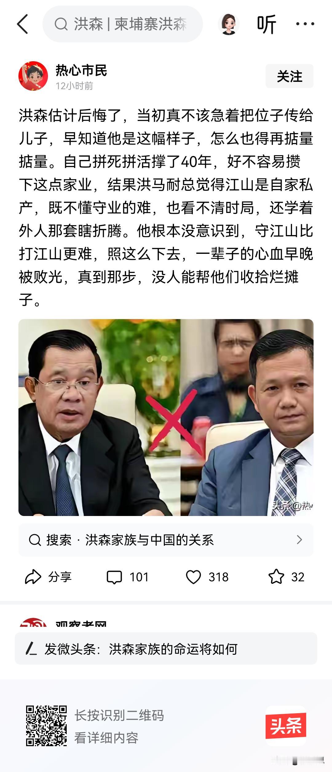其实很多人都认为洪森对选择接班人还是失策了,他以为传给儿子可以保持千秋万代,关键是他儿子没这个能力啊,是吧?他没有历练,就是个官二代。,洪儿子上台不久,中~柬运河开工可以说半/途/而%废,经过这年多观察,他水平能力有限,世界洞察力弱,看不清国际大方向,认不准真心朋友是谁。更没有主见。看一看小小的运河工程就知道。只会跟着美国屁颠屁颠,他的能力如何?有人说也许他在美国读书的时候就被中情局控制了,拿到他了的把柄,他上来之后都是跟着美国屁股走。洪森想想保住他家以后安然无恙,最好还是不要让他儿子接班的。现在还有一点余威,如果他以后不在了,洪二能控制局面吗?别忘了,柬埔寨可是有很强的反对派的。大多数人还是支持国王的。。