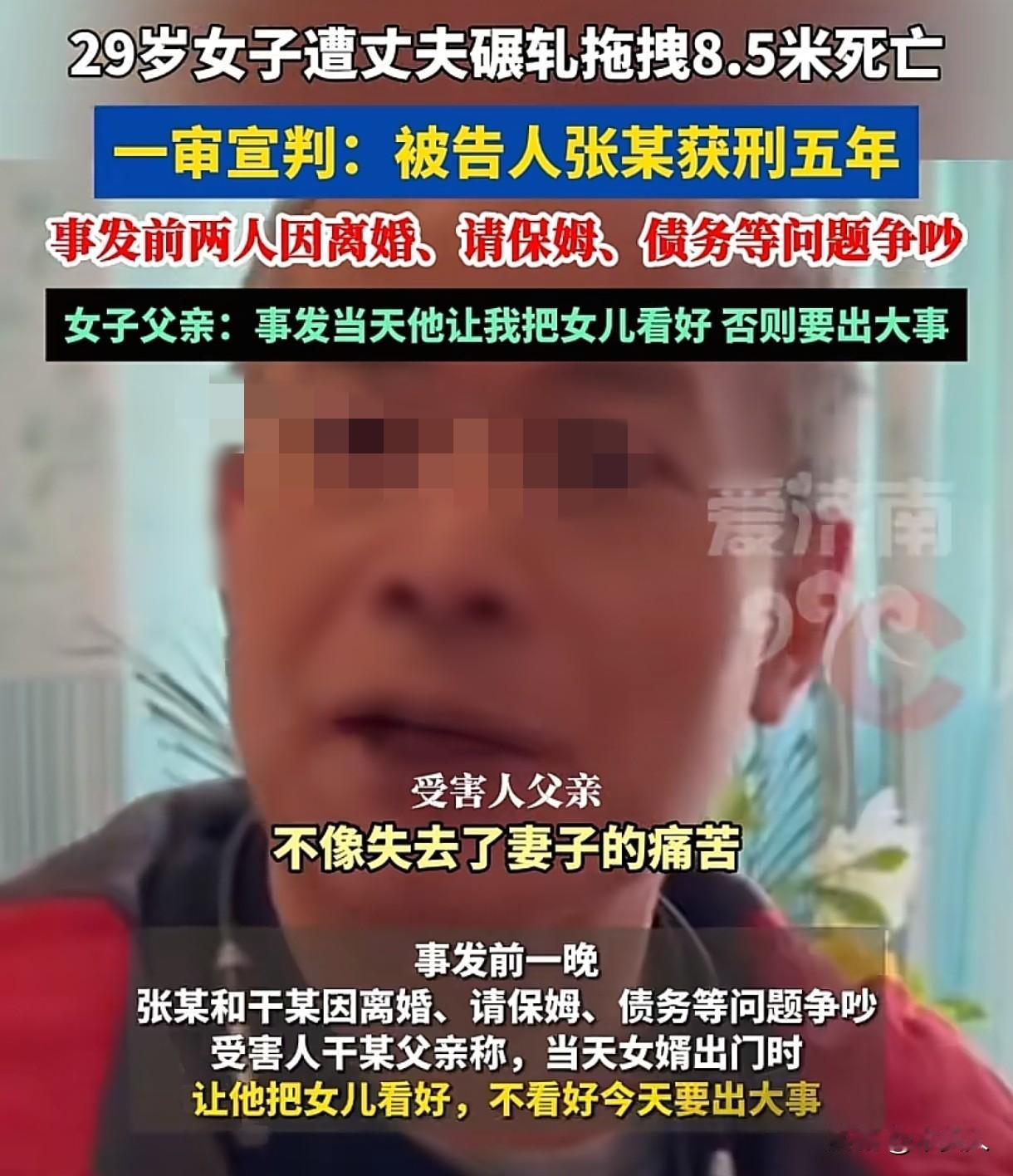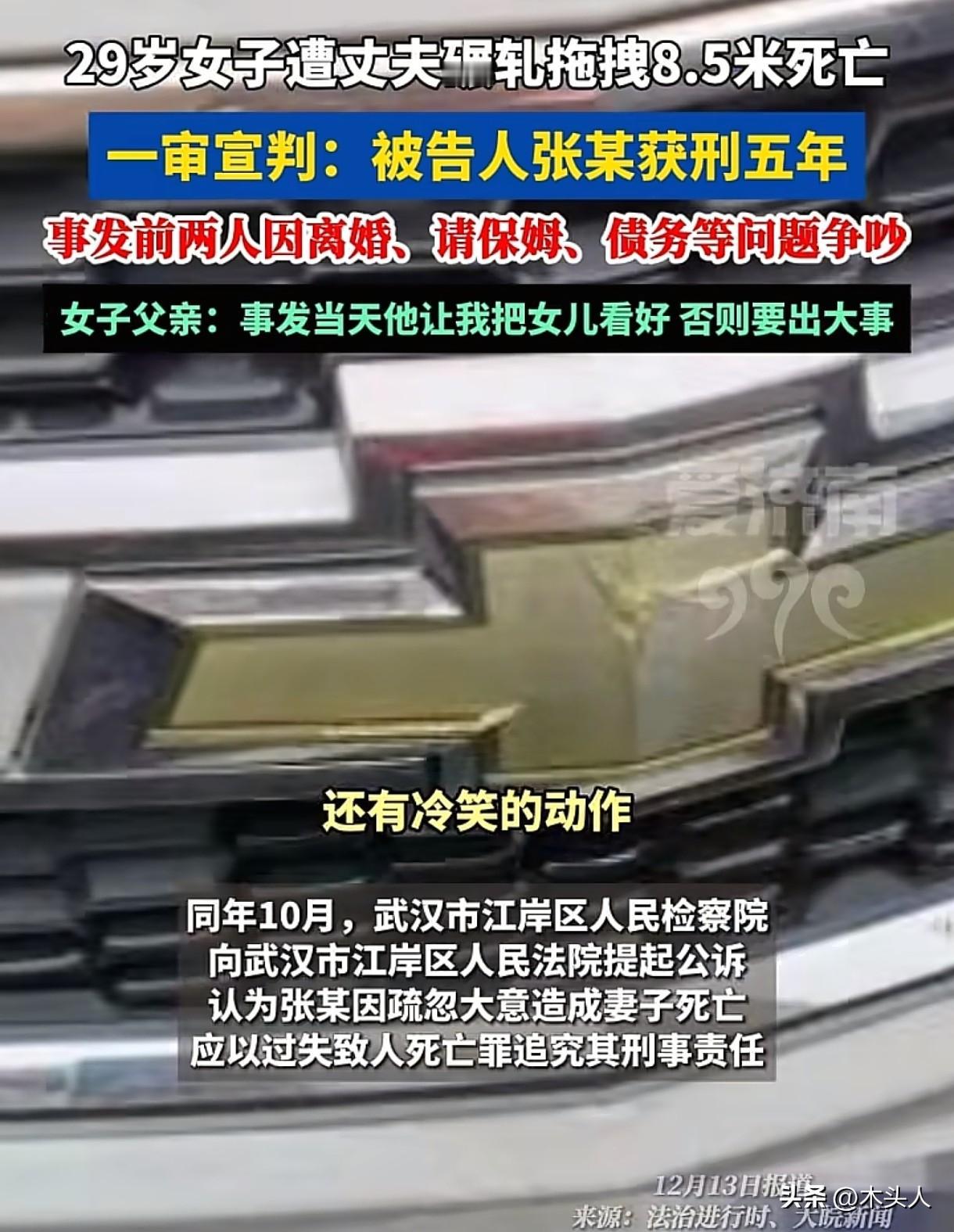 湖北武汉,女子和丈夫发生争吵,两人先后下楼,随后悲剧发生:男子开车碾压拖拽妻子8.5米,导致妻子死亡。男子说是妻子自己钻进车底,躺在地上,地下停车场光线暗,自己没看到,不小心碾压了妻子。事发后男子因过失致人死亡罪被提起公诉,可女子父母怀疑女婿不是过失,而是故意,因为事发当天女婿放下狠话:不看好女儿,会出大事。该案历经4年,目前一审法院宣判:男子犯过失致人死亡罪,判处其有期徒刑5年。 2021年3月6日早上7点多,干先生夫妻接到噩耗:女婿张某开车时,把自己女儿干某碾压在车底了,女儿经抢救无效死亡。 干先生怎么也无法接受这个残酷的现实:自己女儿才29岁,女儿女婿结婚一年多,两人的孩子才3个多月。 小两口的感情一直不太好,事发前两人更是因为债务、请保姆等生活琐事频频发生争吵。 事发当天,女儿女婿再次发生争吵,女儿说要出门买菜,顺便去吃早餐,上午还要出门办事,干先生也没多想,看着女儿坐电梯下去了。 几分钟后,张某留下狠话,也下了楼,之后就是噩耗传来。 面对交警的询问,张某说妻子不是他撞的,而是妻子自己钻进了车底,躺在了地上,地下停车场的光线暗,他压根就没看到妻子在车底下,等他开车发现异常的时候,已经来不及。 事发后,张某因碾压并拖拽妻子长达8.5米致人死亡,被以过失致人死亡罪提起了公诉。 《刑法》第233条规定:过失致人死亡的,处三年以上七年以下有期徒刑;情节较轻的,处三年以下有期徒刑。 可干先生一家却觉得事情远没有这么简单,当时他们看到张某的时候,张某脸上没有一点失去妻子的痛苦,反而出现了冷笑的动作。 在女儿出事后,他们接到律师电话,才得知女儿已经起诉离婚了。 女儿在起诉书中写道:自己婚后除了上班,还要操持家务,带孩子,可张某一点都不帮忙,也不给于经济上的支持,反而经常找她借钱还信用卡。 两人曾一起回老家过年时,张某还对怀有身孕的她进行了殴打家暴的行为,两人的感情已经破裂,再无和好的可能。 另外,张某还找干先生夫妻借了30万元,一直没还。 种种事情联系起来,让干先生一家越想越觉得害怕。 当时小两口正在闹离婚,张某事前放狠话,为什么张某会把自己女儿拖拽8.5米……他们怀疑张某不是过失致人死亡,而是故意的。 过失致人死亡是说行为人因为自己的疏忽大意,没有预见到自己的行为可能会导致他人死亡。 或者虽然预见了,但是轻信能够避免这种结果的发生,结果还是造成了他人死亡。 就像张某说的,他没注意到车底有人,属于疏忽大意,这种情况就可能构成过失致人死亡罪。 他主观上并没有想要杀死对方的故意,只是因为自己的不小心才导致了悲剧的发生。 而故意杀人罪就完全不一样了,故意杀人罪是指行为人明知自己的行为会导致他人死亡,并且希望或者放任这种结果发生。 《刑法》第232条规定:故意杀人的,处死刑、无期徒刑或者十年以上有期徒刑;情节较轻的,处三年以上十年以下有期徒刑。 从刑事处罚的力度来说,过失致人死亡罪要比故意杀人罪轻很多。 事发后,司法机关进行了大量的调查取证工作,也对干某进行了多次尸检,多次开庭一直没有宣判。 2025年12月13日,这起备受关注的男子驾车碾压拖拽妻子8.5米致死案迎来了一审宣判。 一审法院认为,张某驾车时因疏忽大意造成妻子死亡,构成过失致人死亡罪,判处张某有期徒刑5年。 婚姻不仅仅只是两个人的结合,更是家庭的责任和担当。 在婚姻生活中,夫妻之间难免会遇到各种各样的问题,夫妻双方要相互理解,相互包容,好好沟通,要用合理合法的方式去解决问题。 暴力、争吵都是不可取的,更加不要做出一些极端行为。 如果沟通不了,过不下去,双方可以离婚,好聚好散,而不是互相伤害和折磨。
